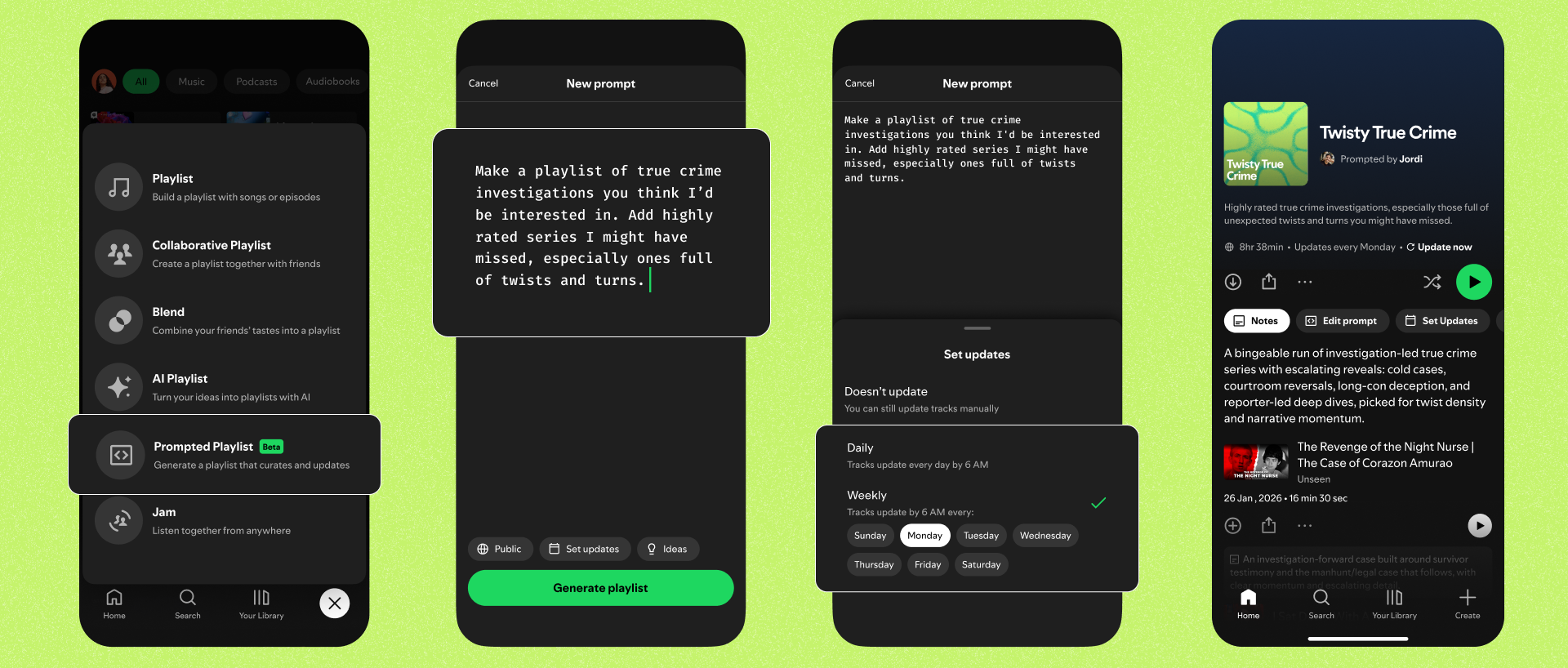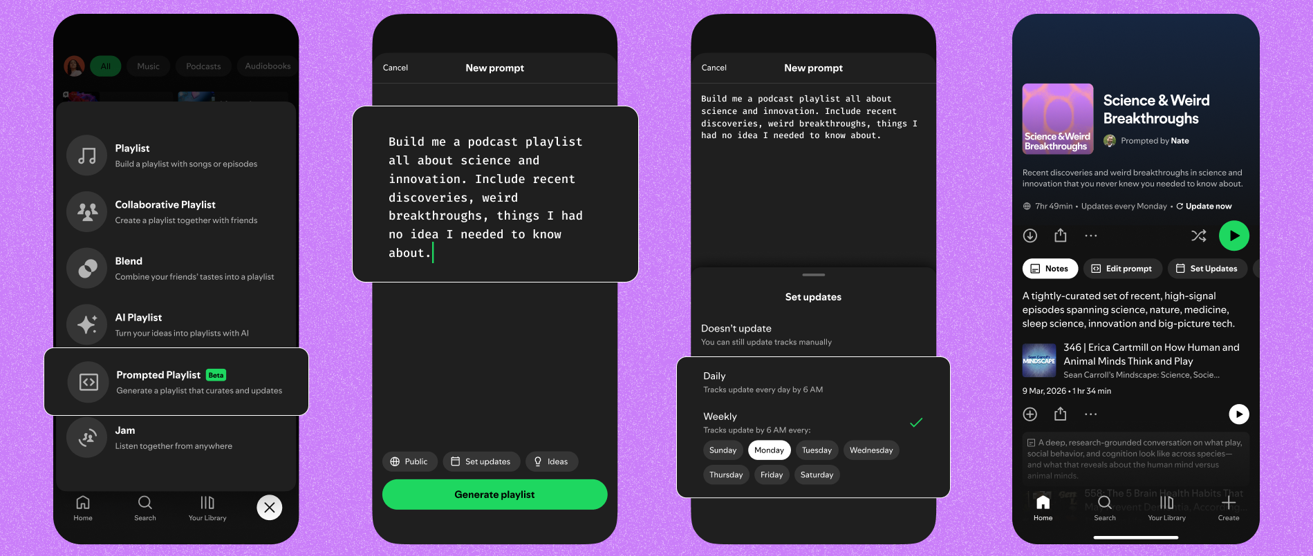 Tavaly decemberben a Spotify elindította a Prompted Playlist opciót, ami nagyon komplex módon, de a felhasználó egyedi igényeihez igazodva képes létrehozni egy lejátszási listát. Ezt a listát pedig rendszeres időközönként automatikusan frissíti is a rendszer, hogy sose váljon unalmassá az új dalok felfedezése.