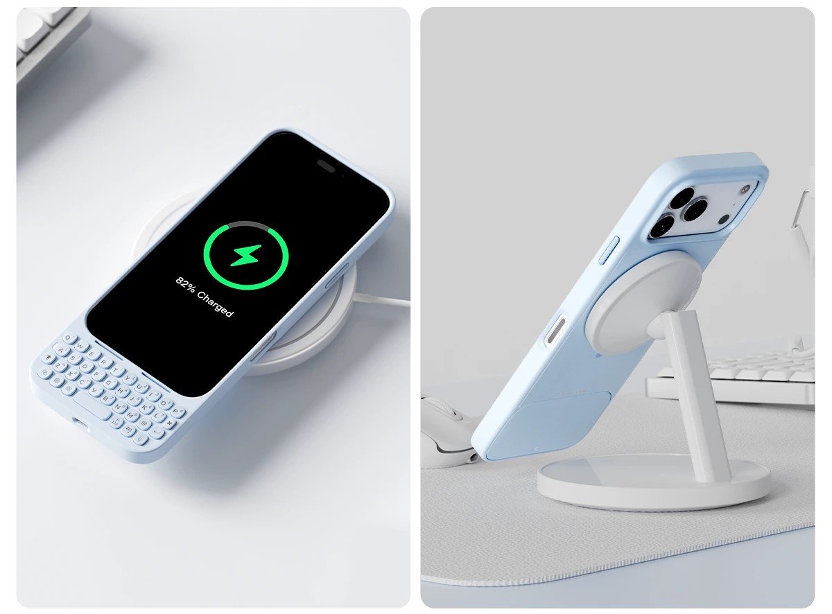 A szerkezet hátoldalán kialakítottak egy kis ajtót, ami mögött egy fészek található. Ide lehet beilleszteni azt a 9 gramm tömegű ellensúlyt, ami a cég tesztjei alapján már pont elegendő ahhoz, hogy a súlypont megfelelően alakuljon. A tokban van mágneses gyűrű is, ennek köszönhetően nem kell letenni a MagSafe kiegészítők használatáról sem. A billentyűzettel együtt is gond nélkül fel lehet majd tenni az iPhone-t mágneses rögzítést használó állványra, vagy éppen tölthető MagSafe power bankkal menet közben.