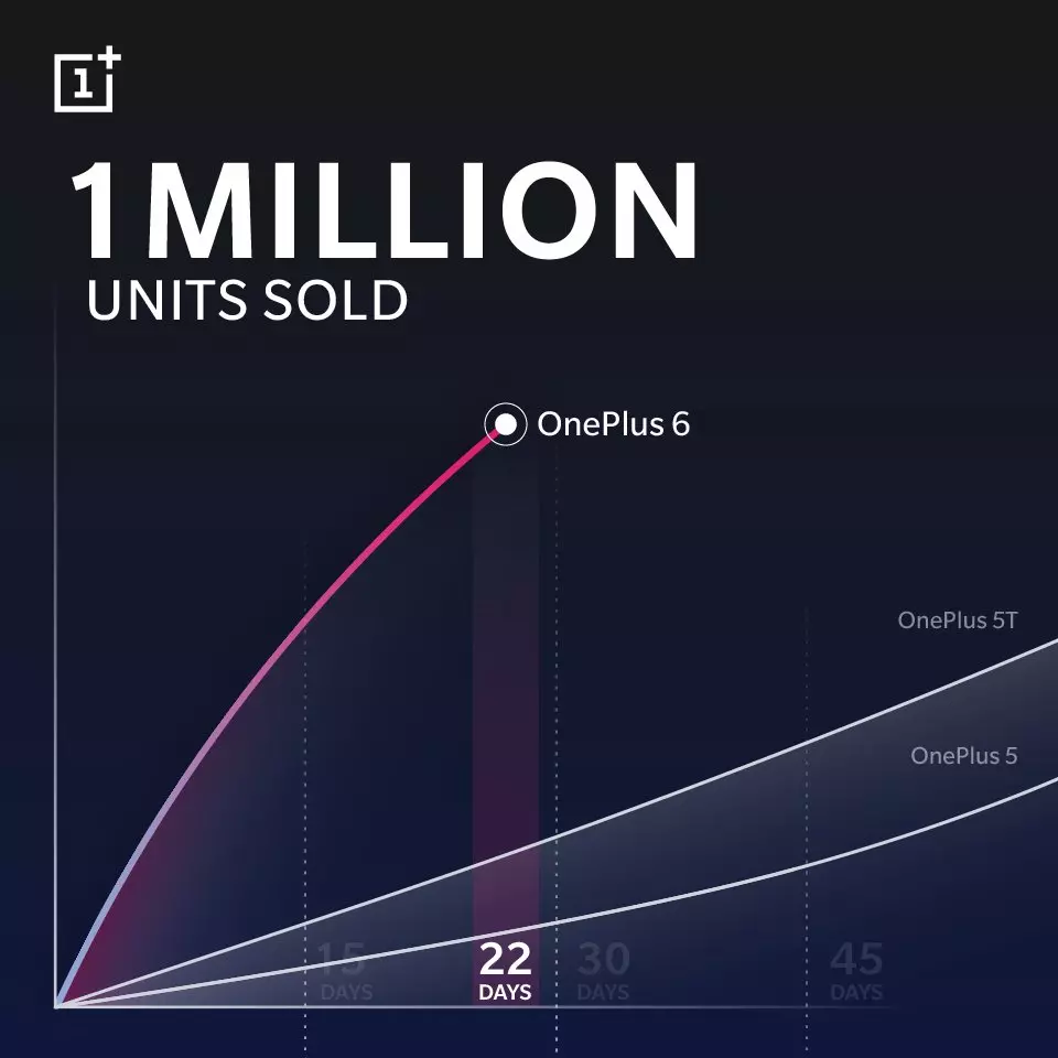 A kínai alakulat már a korábbi okostelefonokat is sikeresnek tekintette, pedig a OnePlus 6 egészen más dimenzióban fogy az eddigi eszközökhöz képest. A cég készített is egy diagramot, amely remekül szemlélteti, hogy mekkorát nőtt az új okostelefon népszerűsége a korábbi társaihoz képest. A OnePlus 5 és a OnePlus 5 T esetében még nagyjából három hónap kellett ahhoz, hogy meglegyen az egymilliós határ.