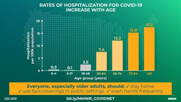 Egy másik, március folyamán négy héten keresztül végzett vizsgálat során 1458 kórházba került beteg mutatóit vizsgálták a szakértők. A hospitalizált betegek 74,5 százaléka 50 év feletti volt, és 54,4 százalékuk volt férfi. A betegek fent látható életkori bontásából világos, hogy a vírus különösen súlyosan érinti az idősebb korosztályt, és a már említett krónikus állapotok kockázatnövelő hatása is megerősítést nyert. A betegek 49,7 százalékának volt magas vérnyomása, 48,3 százalék volt túlsúlyos, 34,6 százalék esetében krónikus tüdőproblémák álltak fenn, 28,3 százalékuk cukorbeteg volt, 27,8 százalékuk pedig szív- és érrendszeri megbetegedésben szenvedett.