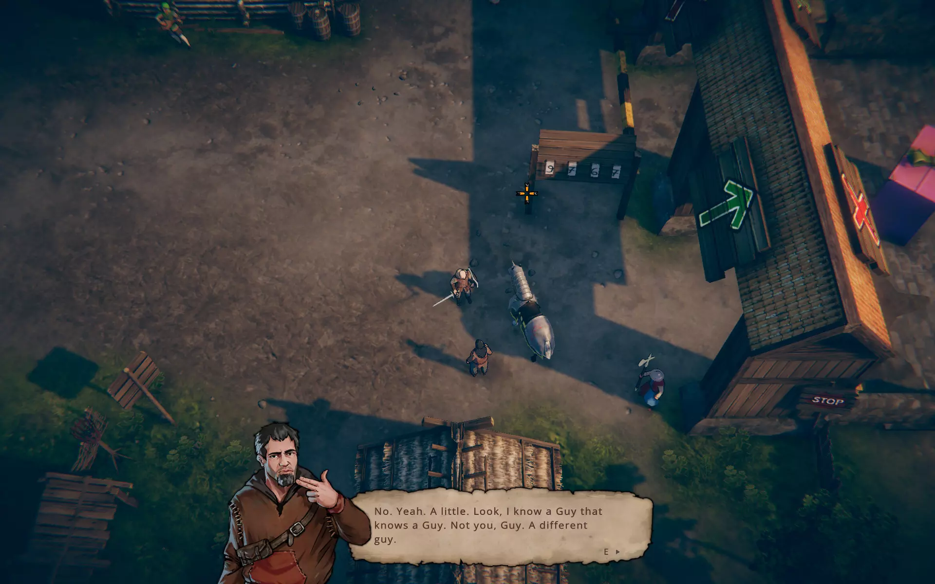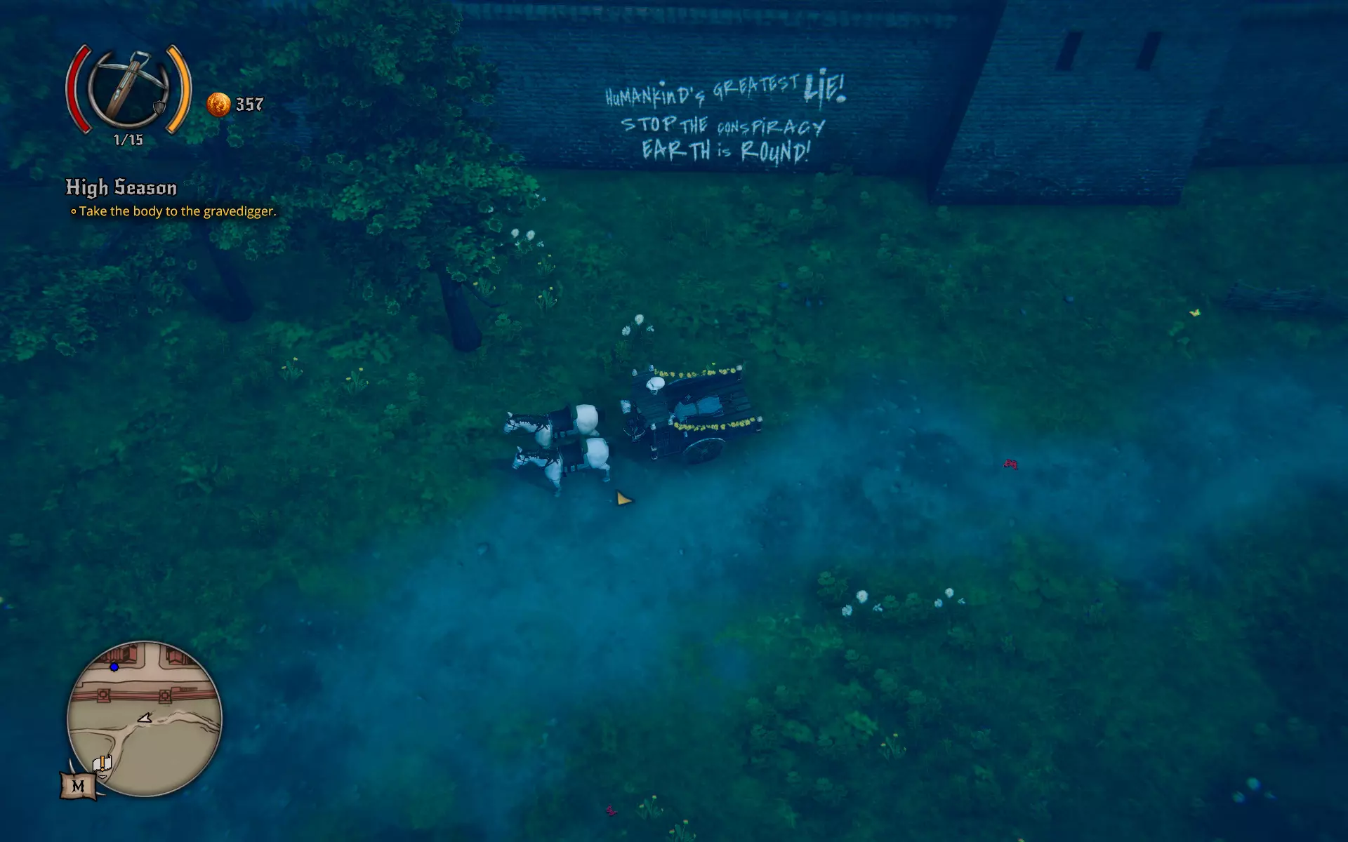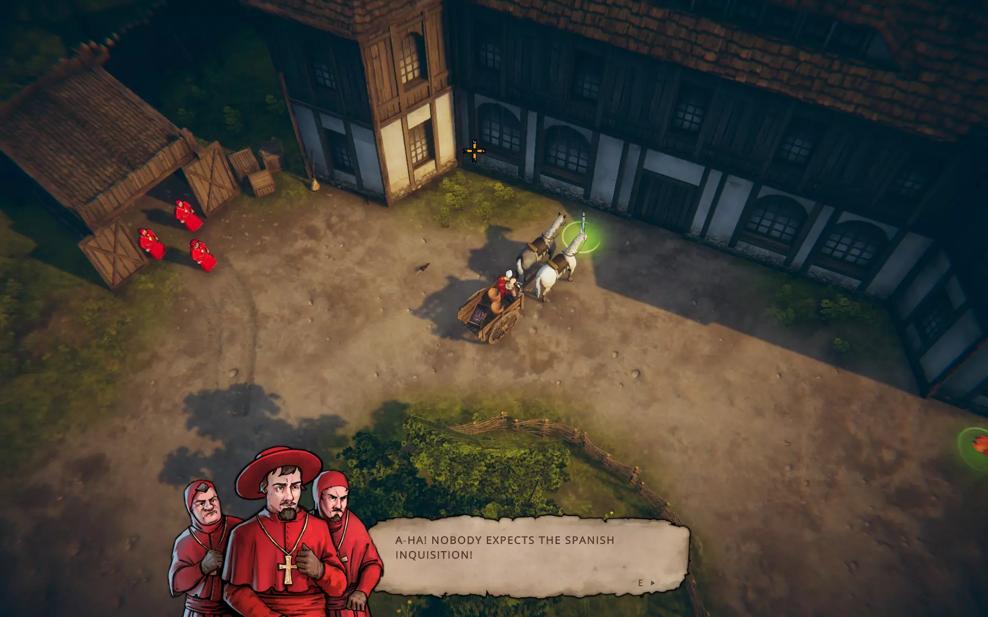Itt a Szent Grál lovagjai egy szeszfőzde, a Beach Boys egy rablóbanda (bár tény, hogy a tengerparton vertek tanyát), a pap fizet azért, hogy háború és járvány híján mi szállítsunk neki hullákat, a hentes szintén szívesen vesz át testeket... feldolgozásra. És ha elég hűen (?) szolgáljuk küldetéseink kiagyalóit, akkor például a Kaszás Halál vagy egy finom úriemberek éjszakai szórakoztatására szakosodott egyéni (szinte mindenre) vállalkozó hölgy ruháit (és sminkjét, parókáját) is magunkra ölthetjük egy bevetés alkalmával. Hogy a francia hülyéknek amúgy hogyan nem tűnik fel, hogy egy kardos, pajzsos, csatalovon érkező figurát engednek be, aki kurtizánnak hazudja magát, az egyáltalán nem rejtély. Ez mindennapos, mondhatni a játék alapfilozófiáját követő helyzet, amihez hasonlóval tucatnyi módon, helyszínen és alkalommal fogunk még találkozni.