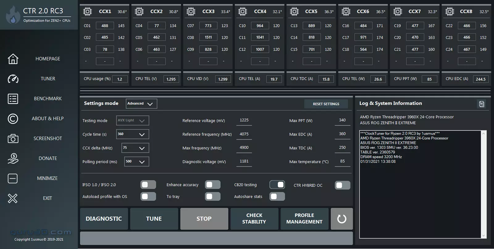 A statikus tuning persze nem egy nehéz dolog, ott általában egy fix magórajelet és magfeszültséget kell beállítani a központi egység számára, ami extra teljesítménnyel jár, cserébe viszont jelentősen romolhat az energiahatékonyság. A ClockTuner for RYZEN ennél sokkal szofisztikáltabb megoldást biztosít, ugyanis rajta keresztül kideríthető, az adott processzorban található CCX tömbök pontosan mire képesek, ezt ráadásul automatikusan is képes megtenni, az alapján, milyen célfeszültséget és célórajelet állítottunk be. A folyamat során apró lépésenként próbálja elérni azt a stabil állapotot, ami a legközelebb áll az általunk áhított eredményhez.
