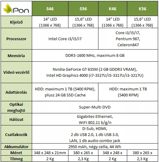 A nagy merevlemez-kapacitás ezeknél a termékeknél is megmaradt, ám az SSD/HDD hibrid adattároló rendszerről a költséghatékonyság jegyében sajnos le kell mondanunk. A K sorozat új tagjai ugyancsak kétféle változatban érkeznek: egy 14 colos és egy 15,6 colos modell formájában, amelyek mindketten 1366 x 768 pixeles natív felbontás mellett üzemelő LCD kijelzőt alkalmaznak. A megfizethető, optikai meghajtóval is rendelkező notebookok ugyancsak harmadik generációs Intel processzorokra támaszkodnak, igaz, itt a Core i 3-as, i5-ös és i7-es modellek mellett egy Pentium és egy Celeron sorozatú központi egység is jelen van a listán.