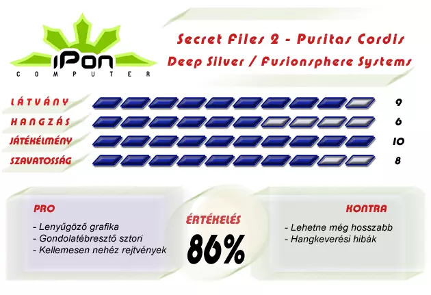 Összességében lenyűgözőre sikerült ez a kalandjáték mind történet, mind a látvány és hangulat tekintetében. A nehézsége is éppen megfelelő és kellemes terjedelmű a játékidő is. A sok rejtély eléggé elgondolkodtat és a mondanivalója sem utolsó. Minden kalandjátékosnak kötelező darab!