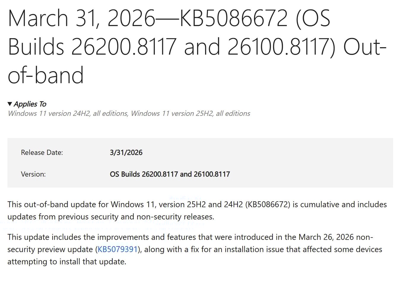A vállalat hivatalos tájékoztatása szerint a soron kívül kiadott KB5086672-es frissítőcsomag már elérhető minden olyan Windows 11 alapú rendszer számára, amelyekre korábban települt a KB5079473-as vagy egyéb frissebb csomag, ezek a rendszerek a Windows Update szolgáltatáson keresztül érhetik el a javítást. A KB5086672-es kiadás ezzel párhuzamosan manuálisan is letölthető a Windows Update Catalog kínálatából.