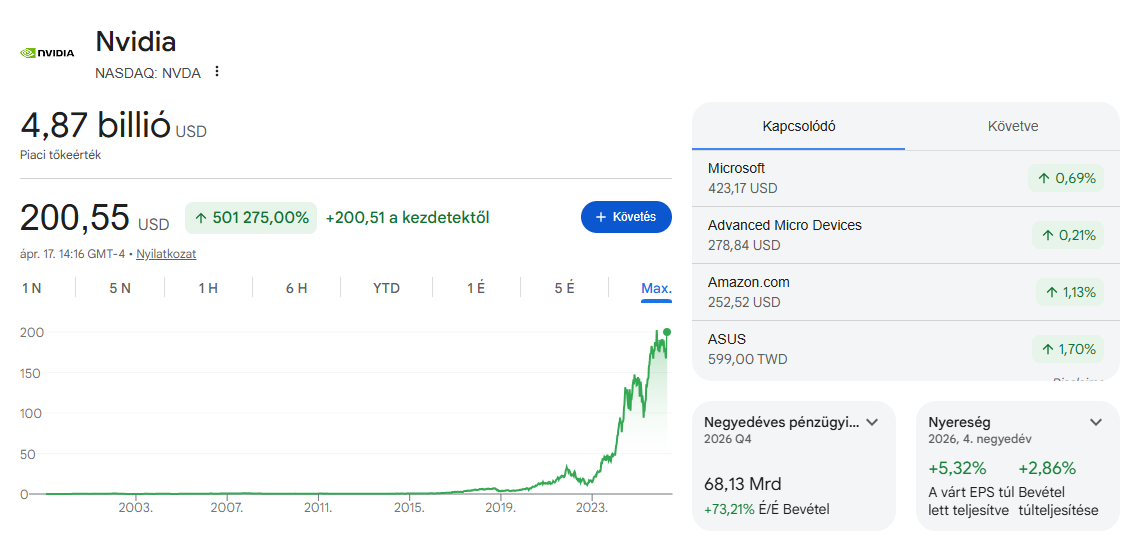 Említés szintjén érdemes kitérni az Nvidia teljesítményére is, hiszen a vállalat immár karnyújtásnyira van attól, hogy a világon elsőként érje el az 5 billió dolláros cégértéket. A vállalat jelenleg 4,87 billió dollárnál és 200,55 dolláros részvényárfolyamnál tart, növekedése töretlen, és az AI láz fordulatszámát elnézve erősen valószínű, hogy rövidesen sikerül elérni az 5 billió dolláros szintet.