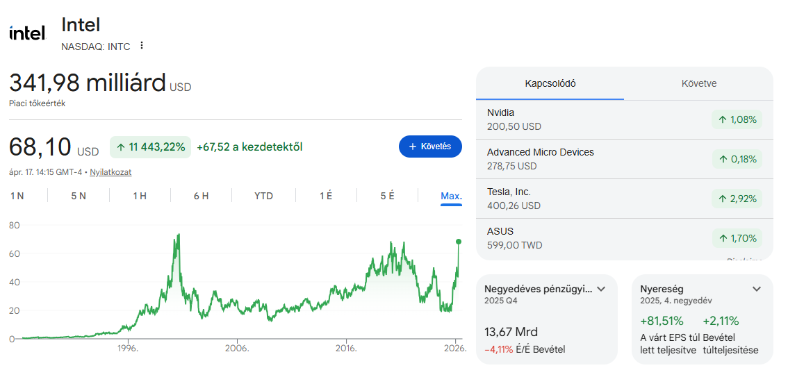 Az Intel esetében jókora hullámvölgyek mutatkoztak, tavaly augusztusban alulértékeltté vált a cég piaci kapitalizáció terén, de az egyre több és több pozitív fejlemény hatására növekedésnek indult a részvényárfolyam, jelenleg pedig azt árazza be a piac, hogy a vállalat végre növekedési pályára áll, lassan letudja a pénzügyi nehézségeit, illetve az Intel Foundry is elkezdi majd kiszolgálni a piaci szereplőket.