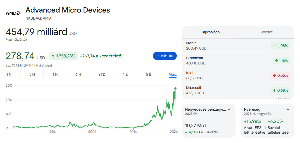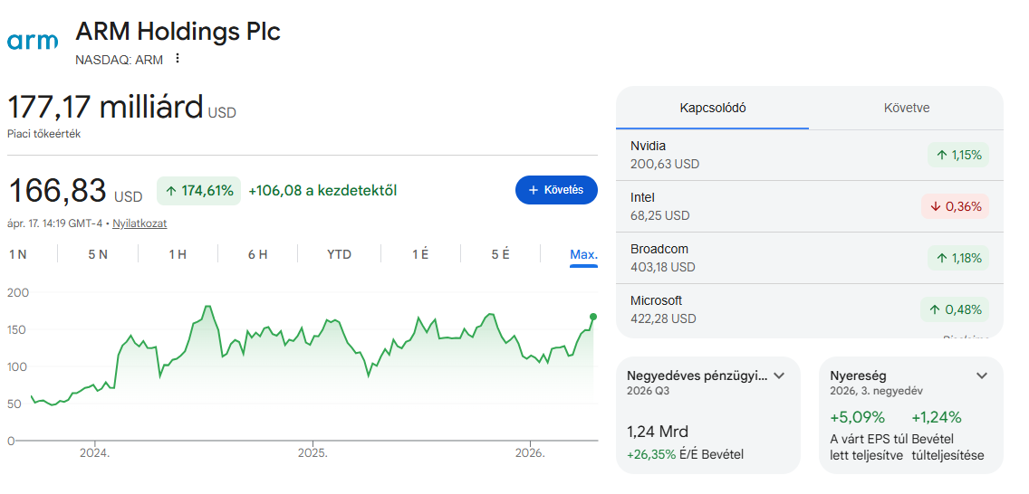 Az AMD is csatlakozott az illusztris társasághoz, a vállalat piaci kapitalizációja ugyanis minden idők legmagasabb szintjére ugrott: hírünk írásakor éppen 455,79 milliárd dolláron áll, amihez 278,74 dolláros részvényárfolyam társul. Az Intelnél közben már 341,98 milliárd dolláros cégérték van érvényben hírünk írásakor, amihez 68,10 dolláros részvényárfolyam tartozik éppen. Az ARM szintén kiválóan szerepel, hiszen 177,17 milliárd dolláros piaci kapitalizációval és 166,83 dolláros részvényárfolyammal büszkélkedhet, hála a március eleje óta tartó növekedési trendnek.
