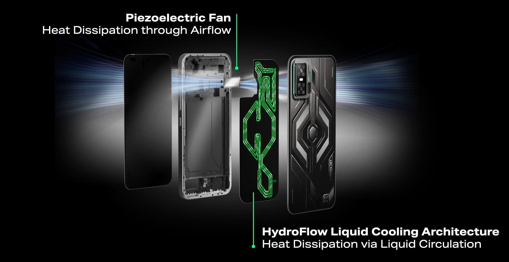 A hűtőfolyadék – ami az extra látványért még fluoreszkál is – akár 6,5 ml/perc sebességgel áramolhat az apró csatornákban, ezekből direkt többet alakított ki párhuzamosan a fejlesztőcsapat, hogy növelje a hőelvezetés hatékonyságát. Az Infinix megjegyezte, hogy arányaiban nagyon gyors keringetési tempóról beszélhetünk itt, kétszer nagyobb tempóval megy a keringetés, mint egy hétköznapi folyadékhűtőben. Ez annak köszönhető, hogy dupla kerámia elem dolgozik a piezoelektromos pumpában.