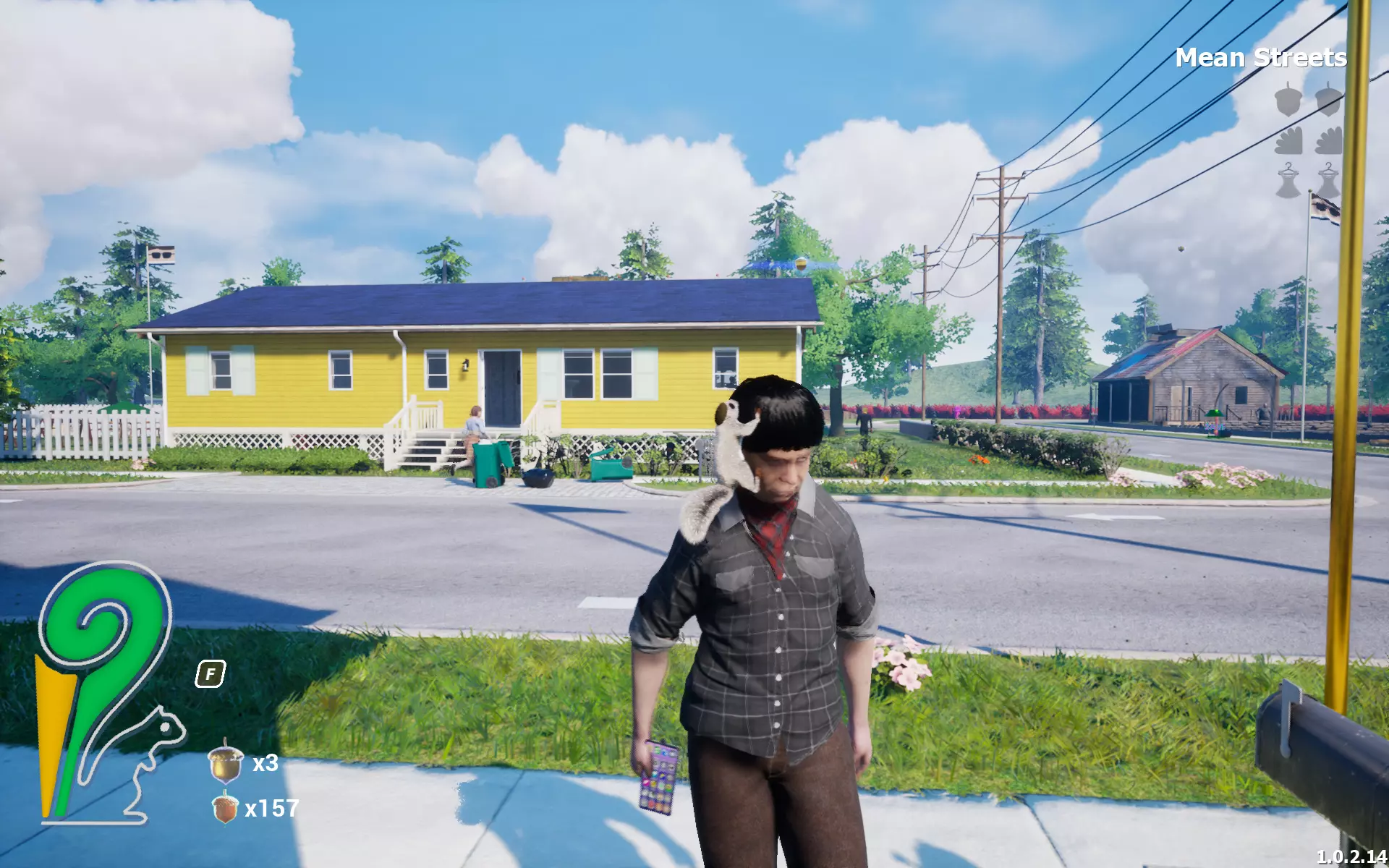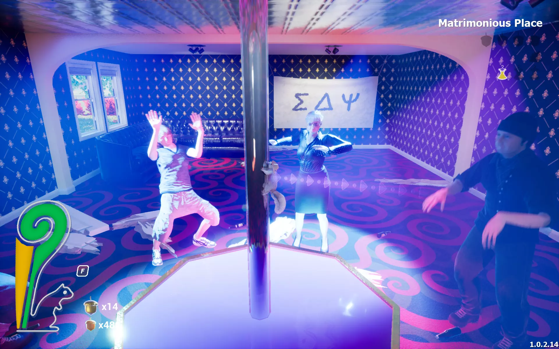 Vagy vegyük csak szemügyre a mellékszereplőket és a helyszíneket kissé közelebbről is. Még annak is több értelme van, hogy az utca embere videózni kezdi a mókusunkat, ha meglátja az utcán, minthogy egy sima, hétköznapi ház ajtaját kinyitva azonnal egy „the floor is lava” játékot szó szerint vevő nagyszobába érünk és persze meghalunk, mert egy ilyen bolond(os) játékban az egyszeri játékos mindennel számolt, de előszobában tárolt lávával aztán tényleg nem. Pedig kellene.