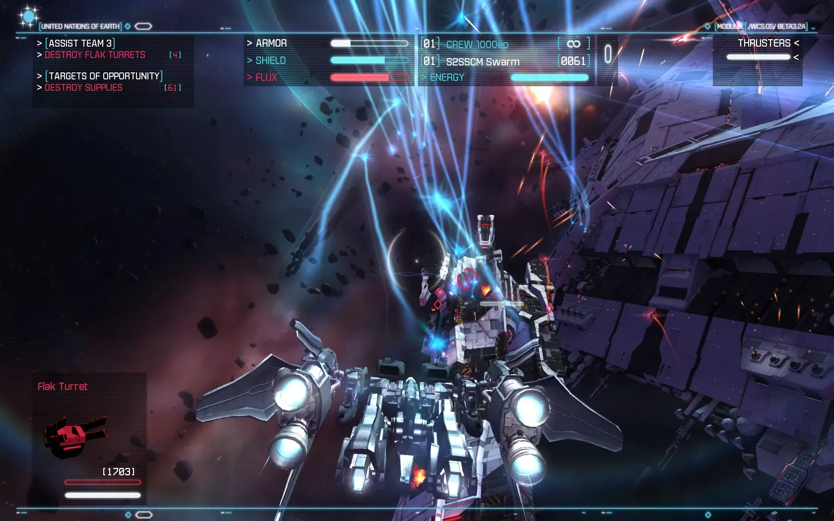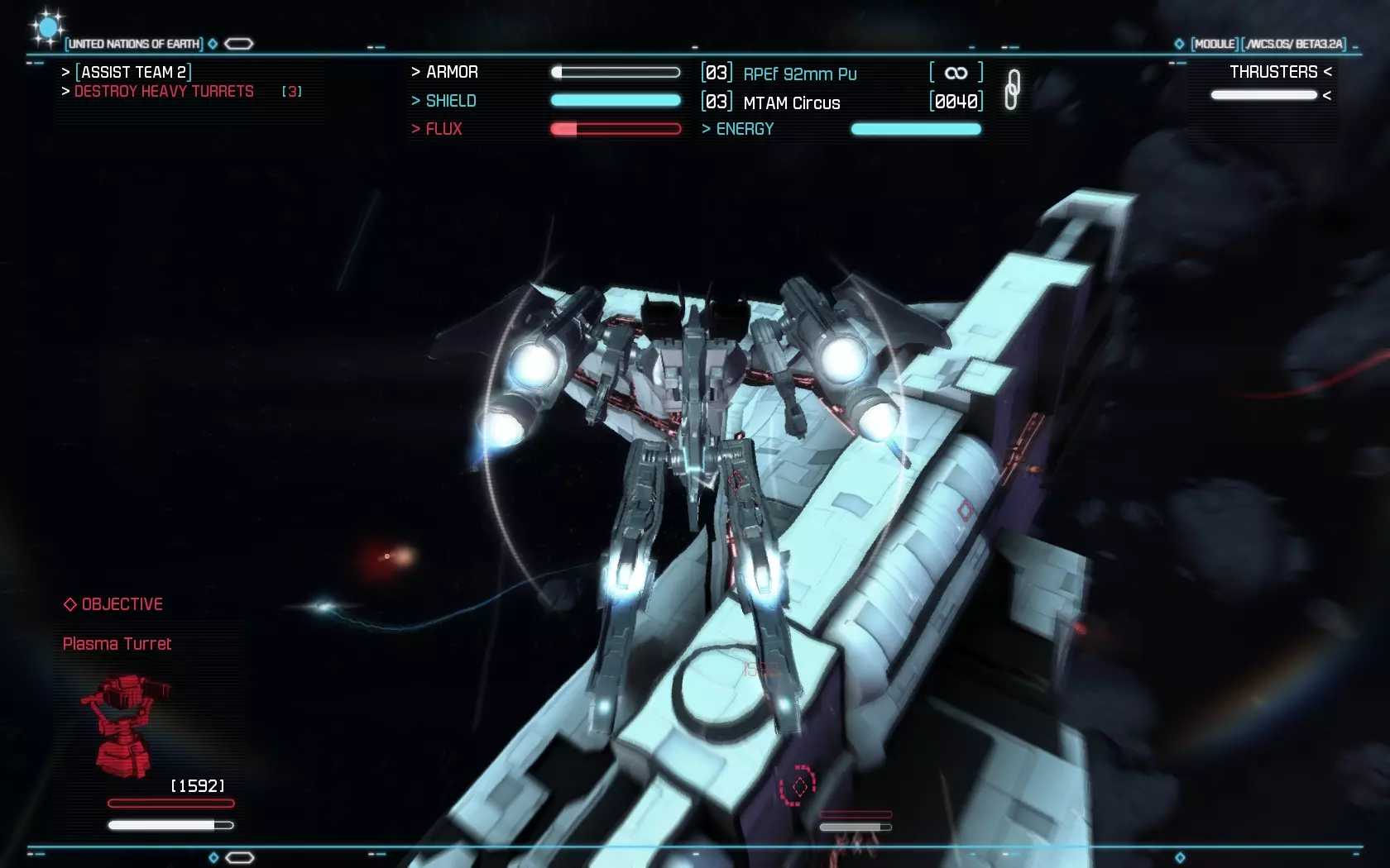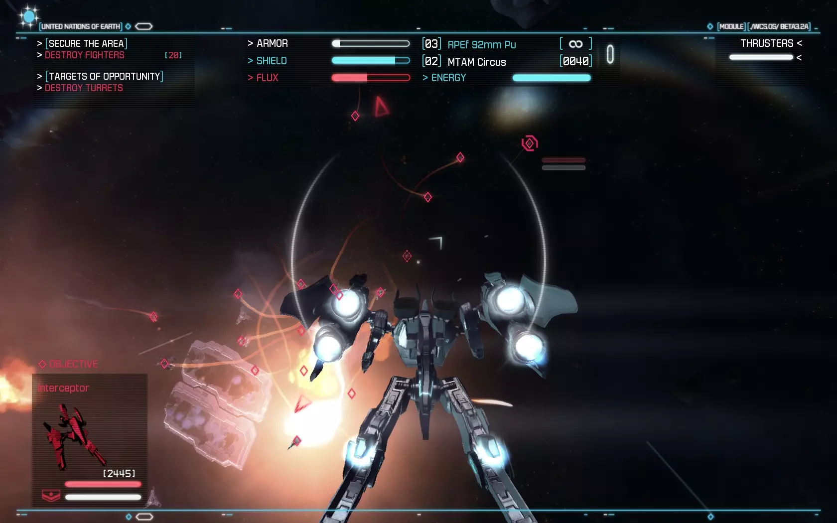 Az űrhajók irányítása, bár nem olyan részletes, mint néhány korábbi klasszikusban, azért kíván némi odafigyelést. Szemmel kell tartani például az energiafelhasználást, ugyanis vannak olyan fegyverek, melyek folyamatosan fogyasztják a naftát, míg mások adott számú tölténnyel működnek. A csúzlik terén nem volt hiányérzetünk, elsődleges és másodlagos típusból is több darab fog a birtokunkba kerülni, ahogy haladunk előre a történetben. A hajtóműnél az utánégető energiájára kell figyelnünk, ugyanis nagy szükségünk lesz az általa biztosított extra sebességre, viszont csak egy korlátozott ideig áll rendelkezésre. A célzórendszer kissé fapados, mi legalább Freespace vagy X-Wing szintű kidolgozottságra számítottunk, ahol szinte mindenre külön lehetett célozni (legközelebbi ellenség, minket támadó, egy adott gépet támadó ellenfél, stb.), itt viszont csak a küldetés tárgyát és a közvetlenül előttünk lévő gépet lehet befogni, ami a harc hevében gyakran kevésnek bizonyul. Használható űrhajóból négy szerepel a programban, ezek a vadász, az elfogóvadász, a bombázó és az úgynevezett Strike Suit. Ezek közül különösen az utolsó érdemel említést. Ez teszi igazán egyedivé a játékot, hiszen egy olyan gépről van szó, ami egy gombnyomással robottá tud átalakulni. Ilyenkor teljesen megváltozik a hajó működése, és nem tud olyan gyorsan előrehaladni, mint korábban, viszont fel, le, jobbra, balra és hátrafelé is tud mozogni. Ráadásul a Strike Suit átváltozva brutális fegyverzettel rendelkezik, egyszerre akár több gépet is meg tud támadni, ráadásul hatalmas erővel. Ezen alak működéséhez viszont Flux energiát kell gyűjteni, amit mások lelövése révén tudunk megtenni. Sajnos a gépnek van egy kis hiányossága, ugyanis elég rövid hatótávolságúak a fegyverei, ami miatt elég közel kell menni a célpontokhoz, ami egyben azt is jelenti, hogy a védelmi lövegek hatótávolságába kerülünk. Ebben a formában nagyon le is lassulunk, így könnyen szétszedhetnek minket a körülöttünk röpködő ellenséges gépek. Nem egyszerű tehát használni a Strike Suitot, amíg nem ismerjük ki rendesen, addig lehet, hogy inkább szenvedés lesz a használata, mint öröm.