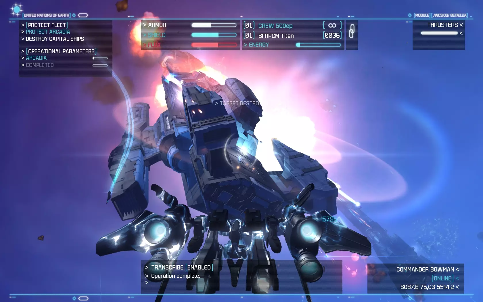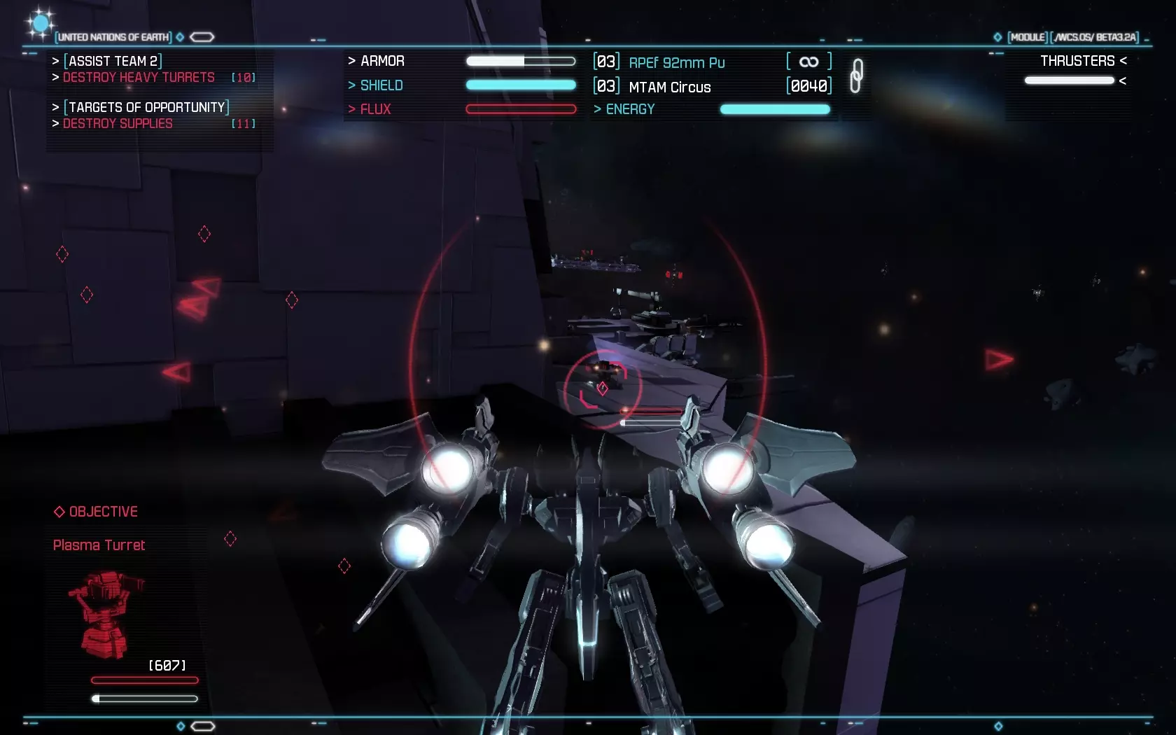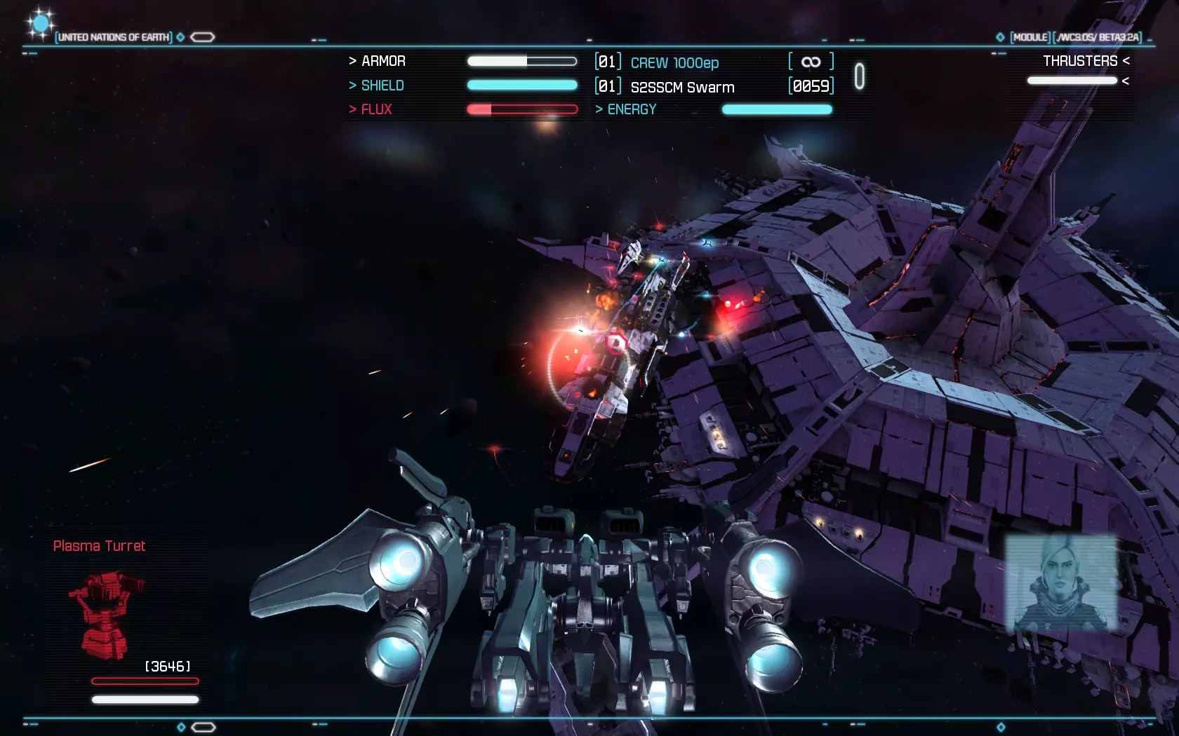 Az űrhajók irányítása, bár nem olyan részletes, mint néhány korábbi klasszikusban, azért kíván némi odafigyelést. Szemmel kell tartani például az energiafelhasználást, ugyanis vannak olyan fegyverek, melyek folyamatosan fogyasztják a naftát, míg mások adott számú tölténnyel működnek. A csúzlik terén nem volt hiányérzetünk, elsődleges és másodlagos típusból is több darab fog a birtokunkba kerülni, ahogy haladunk előre a történetben. A hajtóműnél az utánégető energiájára kell figyelnünk, ugyanis nagy szükségünk lesz az általa biztosított extra sebességre, viszont csak egy korlátozott ideig áll rendelkezésre. A célzórendszer kissé fapados, mi legalább Freespace vagy X-Wing szintű kidolgozottságra számítottunk, ahol szinte mindenre külön lehetett célozni (legközelebbi ellenség, minket támadó, egy adott gépet támadó ellenfél, stb.), itt viszont csak a küldetés tárgyát és a közvetlenül előttünk lévő gépet lehet befogni, ami a harc hevében gyakran kevésnek bizonyul. Használható űrhajóból négy szerepel a programban, ezek a vadász, az elfogóvadász, a bombázó és az úgynevezett Strike Suit. Ezek közül különösen az utolsó érdemel említést. Ez teszi igazán egyedivé a játékot, hiszen egy olyan gépről van szó, ami egy gombnyomással robottá tud átalakulni. Ilyenkor teljesen megváltozik a hajó működése, és nem tud olyan gyorsan előrehaladni, mint korábban, viszont fel, le, jobbra, balra és hátrafelé is tud mozogni. Ráadásul a Strike Suit átváltozva brutális fegyverzettel rendelkezik, egyszerre akár több gépet is meg tud támadni, ráadásul hatalmas erővel. Ezen alak működéséhez viszont Flux energiát kell gyűjteni, amit mások lelövése révén tudunk megtenni. Sajnos a gépnek van egy kis hiányossága, ugyanis elég rövid hatótávolságúak a fegyverei, ami miatt elég közel kell menni a célpontokhoz, ami egyben azt is jelenti, hogy a védelmi lövegek hatótávolságába kerülünk. Ebben a formában nagyon le is lassulunk, így könnyen szétszedhetnek minket a körülöttünk röpködő ellenséges gépek. Nem egyszerű tehát használni a Strike Suitot, amíg nem ismerjük ki rendesen, addig lehet, hogy inkább szenvedés lesz a használata, mint öröm.