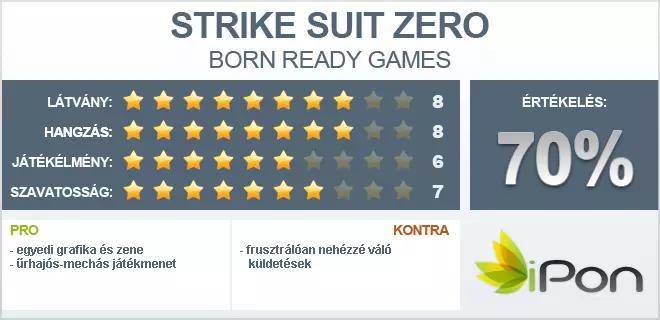A Strike Suit mód újfajta játékélményt kínálA Strike Suit Zero sokak által az egyik legjobban várt Kickstarteres játék volt, és összességében annyit elmondhatunk róla, hogy egy korrekt alkotást tettek le a fejlesztők az asztalra. A játékmenet alapjai többnyire jól átgondoltak, de az tagadhatatlan, hogy vannak problémái a programnak. Itt elsősorban az időnként monotonná és frusztrálóan nehézzé váló küldetésekre gondolunk, de dolgozhattak volna még kicsit az irányításon is. Reméljük ezeket a hibákat amennyire tudják, kijavítják majd a fejlesztők, mert jelen állapotában csak a keményvonalas űrszimulátor rajongóknak tudjuk ajánlani a játékot.
