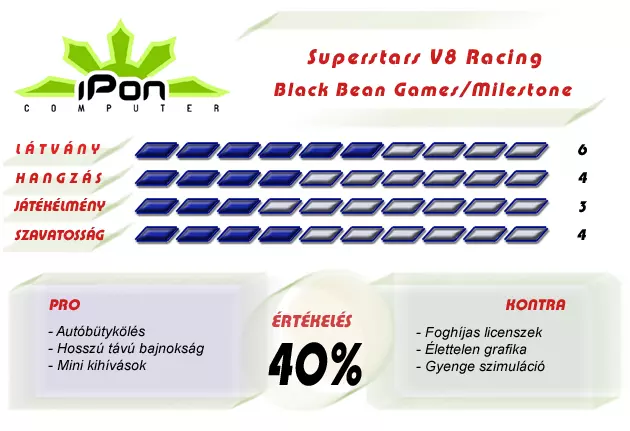 Mindezek tekintetében sajnos azt kell, hogy mondjam, nem lett jó játék a Superstars V8 Racing. El lehet venni vele egy pár napig, de ha végigvittük a bajnokságot, és ne adj' Isten még a mini feladatokat is megcsináltuk, akkor már tényleg nincs miért tovább bámulnunk a képernyőt. Nagyon gyenge lett a játék, aki színvonalas árkád versenyt akar, az szerezze be a GRID-et, aki pedig szimulátorra vágyik, az vegye meg a Race 07-et, vagy a Race Pro-t, esetleg szedje le az ingyenes Volvo: The Game-et, és megtudja, mi is az, amiért a SimBint ennyire dicséri mindenki!