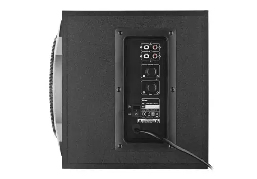 Az aktív, azaz erősítőt is tartalmazó mélyládán találunk két pár RCA csatlakozót, de mellettük egy áramtalanító kapcsoló, valamint két szabályzóegység is lapul – egyik a hangerőt, másik pedig a mélyhangok erősségét szabályozza. A szetthez 3,5 milliméteres Jack audió kábelen keresztül iPad, iPod és MP3 lejátszó éppúgy csatlakoztatható, mint asztali számítógép, noteszgép, táblagép, illetve ultrabook.