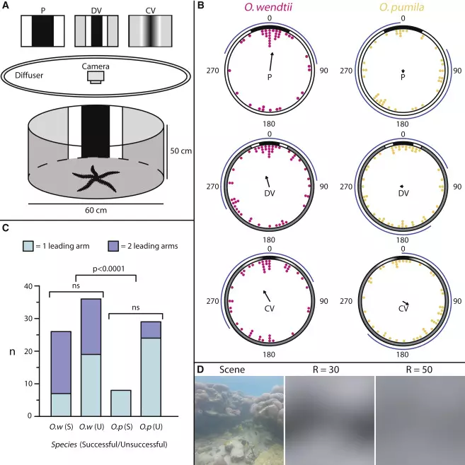 A kutatók a vizsgált állatokat egy 60 centiméter átmérőjű, hengeres tartályba helyezték. A tartály falát egy keskeny sávban feketére színezték, majd fehér szegélyt vontak a sáv köré, míg a fal többi részét meghagyták szürkének. Mivel a fekete és fehér részek nagyon közül voltak egymáshoz, a róluk visszaverődő fény interferálva a szürke részekkel azonos intenzitást eredményezett. Ez azt jelenti, hogy egy pusztán a fotonok jelenlétét érzékelni képes állat nem lehet képes azonosítani a fekete sáv helyét a tartályban. Az O. pumila esetében így is történt, az O. wendtii azonban megtalálta a sötétebb sávot, és elindult felé, hogy jobb búvóhelyet találjon.