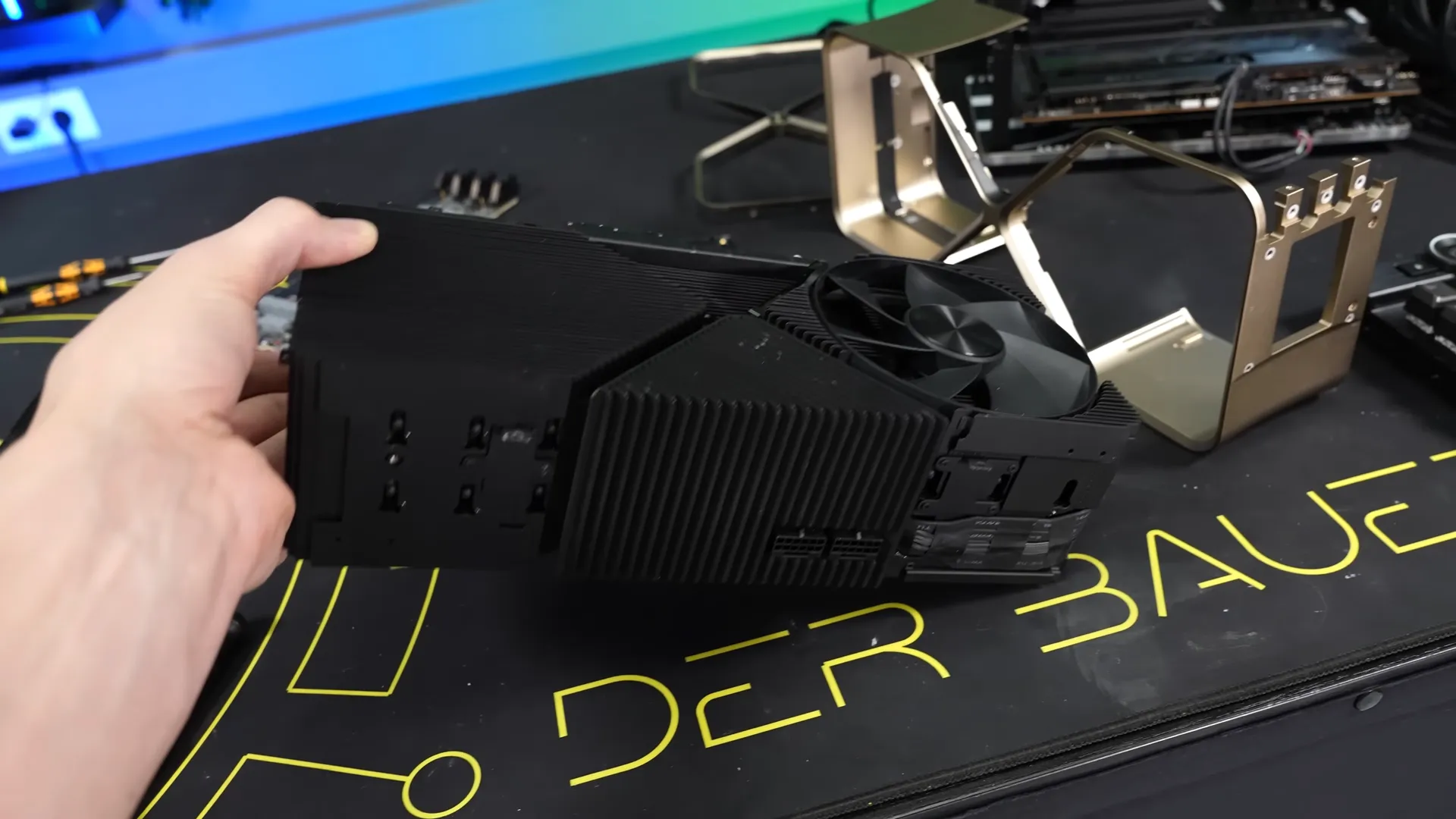 A négy slotnyi helyet foglaló monstrum egy igazi különlegesség, amelynél nem a klasszikus felépítést használták, ezt jól mutatja az is, hogy a hűtőtömb lamelláin át lehet látni, vagyis nincs mögöttük nyomtatott áramköri lap, ahol normál esetben lenni szokott. Ez azért van így, mert a nyomtatott áramköri lap a PCI Express 5.0 x16-os slotra merőlegesen foglal helyet, vagyis a videokártya alsó éle mentén helyezkedik el. A videó kimenetek ezért kerültek egymás fölé és nem egymás mellé, itt viszont nem egy külön nyomtatott áramköri lapon foglalnak helyet, mint például a GeForce RTX 5090 Founders Edition modellnél, hanem a fő nyomtatott áramköri lapra kerültek. A hatalmas videokártya három darab DisplayPort 1.4a és egy darab HDMI 2.1-es videó kimenettel érkezik.