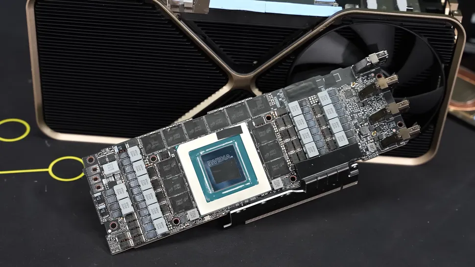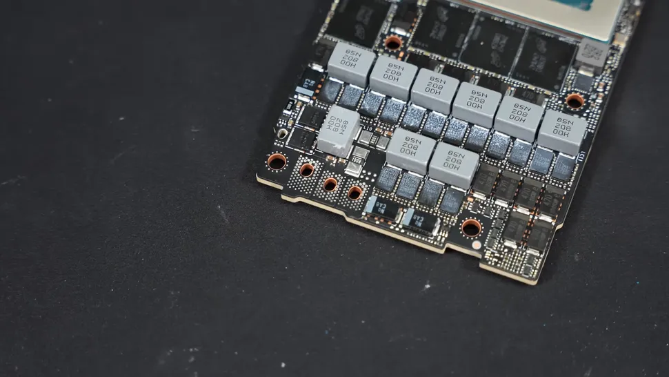 A videokártya szétszedéséhez először a videó kimenetek körüli borítást kell eltávolítani, majd az az alsó takarólemez leszedhetővé válik, ami hőcsöveket is tartalmaz, így gyakorlatilag hátlapi hűtőlemezként funkcionál, ami hővezető lapokon keresztül érintkezik a melegedő komponensekkel, például a memóriachipekkel és a VRM áramkör alkatrészeivel. A memóriachipekből egyébként összesen 24 darab áll rendelkezésre, a nyomtatott áramköri lap mindkét oldalán találunk 12-12 darabot, így jön össze a 48 GB-nyi GDDR7-es VRAM.