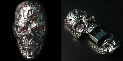 A különlegesség a fent említett filmben szereplő T-600-as modell koponyáját ábrázolja és meglehetősen jól néz ki. A japánból származó érdekes pendrive-ot készítői annyira élethűre próbálták formálni, amennyire csak lehet, a képek alapján ez sikerült is. A nem mindennapi ház, azaz Terminátor-fej belsejében egy 2 GB-os adattároló kapacitással rendelkező NAND Flash chip van jelen, ami ugyan nem egy nagy durranás, de ez esetben nem is itt van a fő hangsúly. A pendrive egyébként 42 grammos súllyal büszkélkedik és kompatibilis a Windows XP/Vista, valamint a Mac OS 10.2-es vagy újabb operációsrendszerekkel egyaránt.