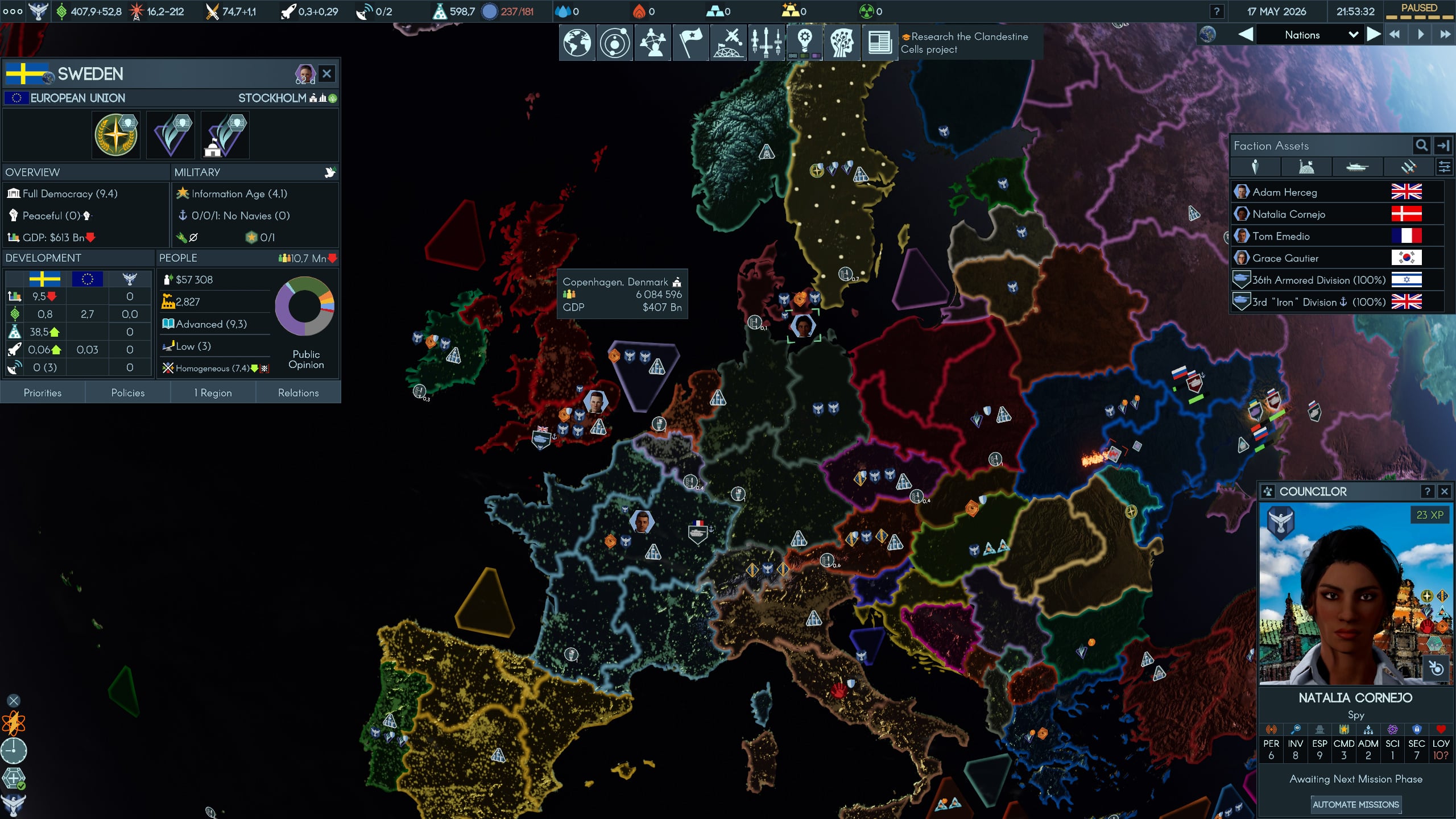 És ezek a dolgok nem apránként kapcsolódnak be a játékba, hanem az első pillanattól léteznek, csak esetleg még nem tudunk róla, vagy még nem elérhető, de az alapozást akkor is meg kell(ene) kezdeni hozzá. Az ügynökeink mozgatása és használata egy külön játéknak is elmenne, és olyan részletes gazdasági/társadalmi/katonai funkciója van minden egyes országnak, hogy az zavarja ejtő, még egy Civilization V is egyszerű 2 kattintásos játéknak tűnik mellette.