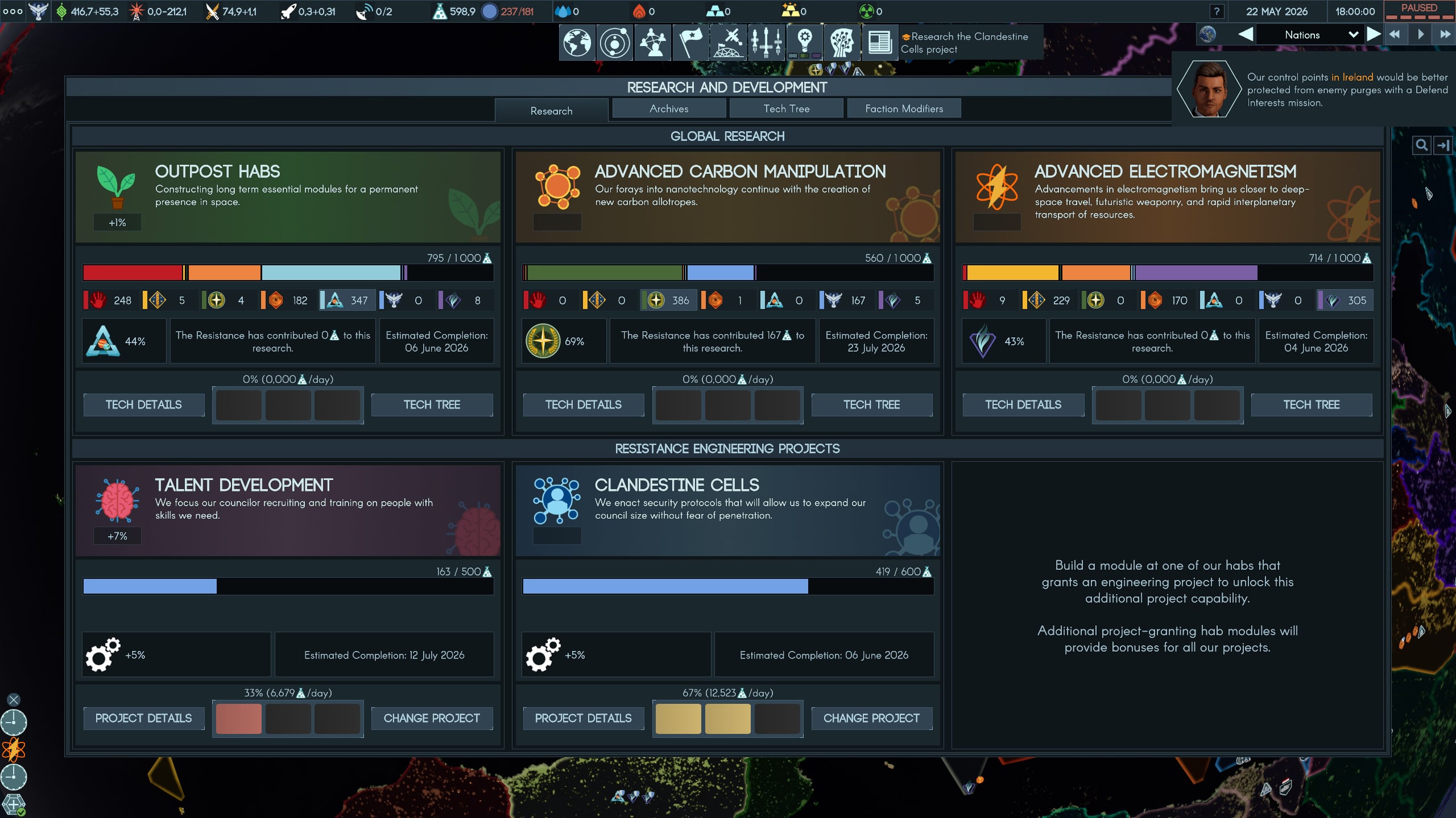 Nem véletlen, hogy tutorial és magyarázó videók készültek a játékhoz, ugyanis a Terra Invicta elsőre lehengerlően bonyolult, de ebben rejlik a szépsége is. Kis túlzással egyszerre kell mindenre figyelnünk: a terjeszkedés, a befolyásolás, a bolygó eseményei, a kutatás, a földönkívüli fenyegetés radarozása, majd bázisokat létesítünk pl. a Holdon, aszteroidákon és bolygókon, nyersanyag-láncokat építünk később pedig saját űrflottát tervezünk és gyártunk.