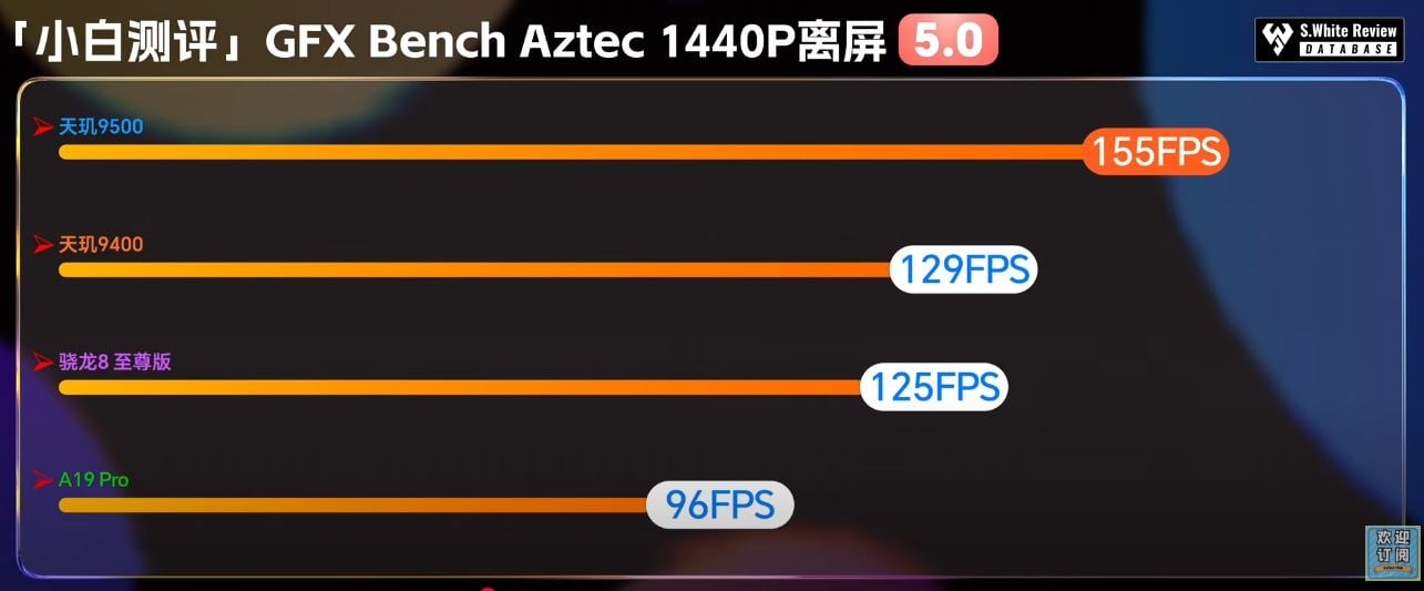 Valamelyest ennél is nagyobb gyorsulást mért a youtuber a GFX Bench Aztec (1440p) teszt alatt, ahol már 155 FPS-es rekord eredményt tudott felmutatni a Dimensity 9500, miközben a Dimensity 9400 129 FPS-sel vezetett eddig. Ebben a megmérettetésben az Apple hátránya még nagyobb, az A19 Pro csak 96 FPS-t produkált, vagyis több mint 60 százalékos differenciáról beszélhetünk. Ebben a tesztben az lesz majd az érdekes, hogy a Snapdragon 8 Elite Gen 5 mit tud majd nyújtani – a Snapdragon 8 Elite még elmaradt a Dimensity 9400-tól előzőleg.