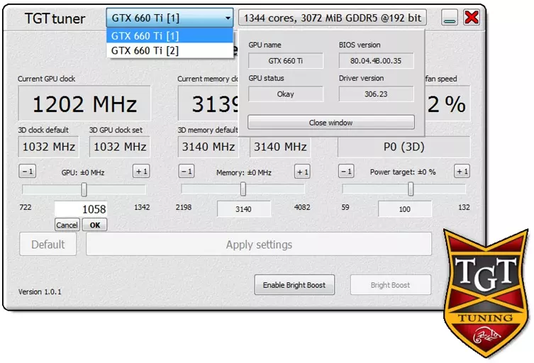 Az alkalmazás segítségével a GPU alap órajele mellett a memóriachipek órajele is módosítható, plusz figyelemmel kísérhetjük a GPU aktuális hőmérsékletét, valamint a hűtőventilátor pillanatnyi fordulatszámát is. Hab a tortán, hogy a TGT BigBang még a Power Target értékének növelésére is lehetőséget ad, ami tuning alkalmával lehet fontos.