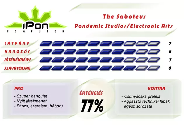 Az apró hibák persze zavaróak, de nem találkozni velük olyan sűrűn, hogy nagyon lerontsák a játékélményt. A hangulat és a teljes játékbéli szabadság tökéletesen egyensúlyozza ezt, viszont a The Saboteur így sem ér fel egy Mafia vagy egy GTA nagyságáig, még ha a készítők mindent bele is adtak, hogy jól érezzük magunkat Párizsban. A szavatossággal viszont nincs gond, ha meg tudunk barátkozni a tökéletlen kivitelezéssel, akkor a The Saboteur esélyes egy 100%-os befejezésre, ami ugye tudjuk jól, nem könnyű egy ilyen stílusú játékban. Karrierünk aktuális állását, és a statisztikákat egyébként bármikor elérhetjük a főmenüből, de említésre méltóak még az achievementek és a trófeák is, melyek nem csak a feladatok teljesítéséért jutalmaznak minket kövér pontokkal, de akkor is, ha összegyűjtünk minden képeslapot, sokat cigizünk, megcsókolunk ötven nőt, vagy mondjuk felmászunk az Eiffel-torony tetejére, és le is ugrunk onnan!