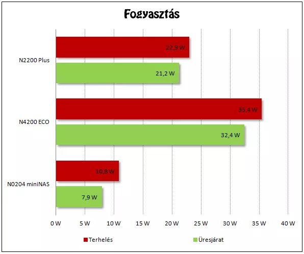 Az N4200 az Atom D525-ös processzorral, illetve az 1 GB-nyi DDR3-as memóriával és két 3,5 hüvelykes merevlemezzel már jelentősen többet fogyasztott, mint az N2200 Plus, de az N0204 miniNAS-sal összehasonlítva még látványosabb a különbség. Cserébe meggyőző írási- és olvasási teljesítményeket kapunk, ahogy az lentebb is látható.