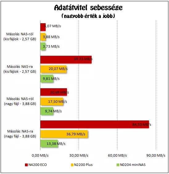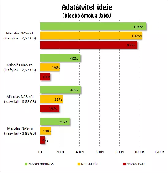 Ahogy az a fenti két diagramból is kiderül, a NAS-ok a papírforma szerint teljesítették a teszteket. Az N0204 miniNAS szerény teljesítményt mutatott fel, de energiatakarékossága és pici mérete kárpótolhat minket a szerény adatátviteli teljesítményért. Ha sokszor kell a hálózaton sok adatot mozgatni, akkor ez a NAS nem a mi NAS-unk.
