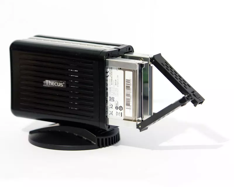 A NAS által támogatott merevlemezekről itt találunk egy listát. A merevlemezek tárolásáról gondoskodó fiókokhoz a NAS hátulja felől tudunk hozzáférni. A fiókok, pontosabban a NAS alaplapja SATA 1,5 Gbps-os és SATA 3 Gbps-os adattárolók fogadására képes és mind hot swap, mint pedig hot plug támogatást kínál. Ez utóbbi annyit jelent, hogy a hibás merevlemezt a NAS kikapcsolása nélkül, egyszerűen cserélhetjük. A rendszer RAID 0-s és RAID 1-es támogatás mellett JBOD támogatást is kínál, sőt, képes a RAID tömb automatikus újraépítésére is, természetesen RAID 1 esetén.