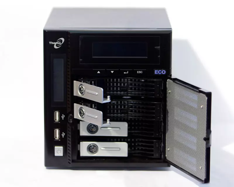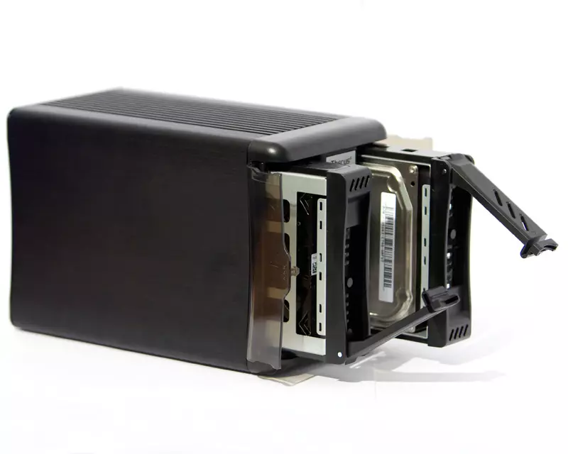 A merevlemez keretek két átlátszó, füstszínű műanyag ablak mögött lapulnak. Az adattárolókhoz a RAID 0 és RAID 1 mód mellett JBOD módot is alkalmazhatunk.