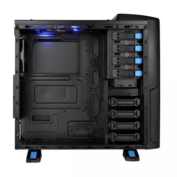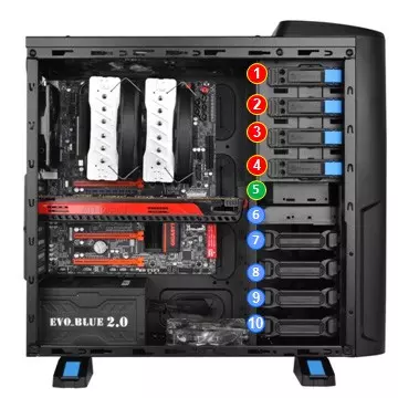 A külső bővítőhelyek között négy 5,25 colos, illetve egy 3,5 colos meghajtó öböl lapul, míg a ház belsejében öt darab 3,5 colos adattároló számára van hely, de akár 5 darab 2,5 colos meghajtót is elhelyezhetünk a fiókokban - legalábbis a gyártó hivatalos weboldalán ez az információ szerepel. A bővítőhelyek egyszerűen, szerszámok használata nélkül megtölthetőek adattárolókkal.