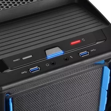 Az előlapi portok között - amelyek a ház tetején kaptak helyet - két USB 3.0-s port, egy fejhallgató kimenet és egy mikrofon bemenet sorakozik. Az új számítógépház négy nagyméretű, kifelé néző talpon áll, jobb oldallapján pedig egy kihajtható akasztó is helyet kapott, ami jól jön, ha szünetet tartunk játék közben, hiszen itt remek helye van a fejhallgatónak.