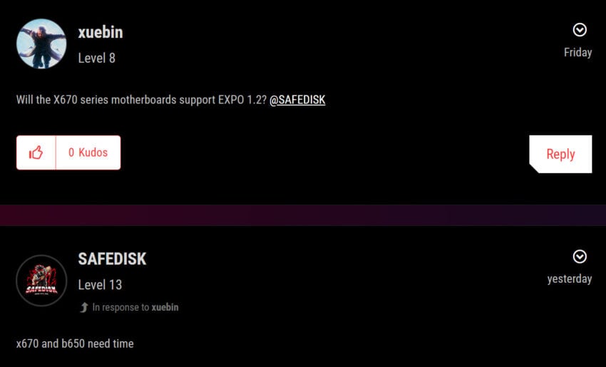Az ASUS RoG részlegén dolgozó extrém tunigos, aki SAFEDISK becenév alatt tevékenykedik és a RoG alaplapokhoz készített béta BIOS-okkal foglalkozik, kifejtette, hogy az AMD EXPO 1.2 támogatása nem csak és kizárólag a 800-as sorozatú lapkakészletekkel ellátott alaplapok mellé érhető el, hanem az X670-es és a B650-es modellekhez is elérhető lesz, de az implementálásaa régebbi generáció tagjainál több időt vesz igénybe, vagyis a 600-as sorozatú lapkakészletekkel ellátott alaplapok mellé majd csak később érkeznek az EXPO 1.2-es támogatással felvértezett BIOS-ok.
