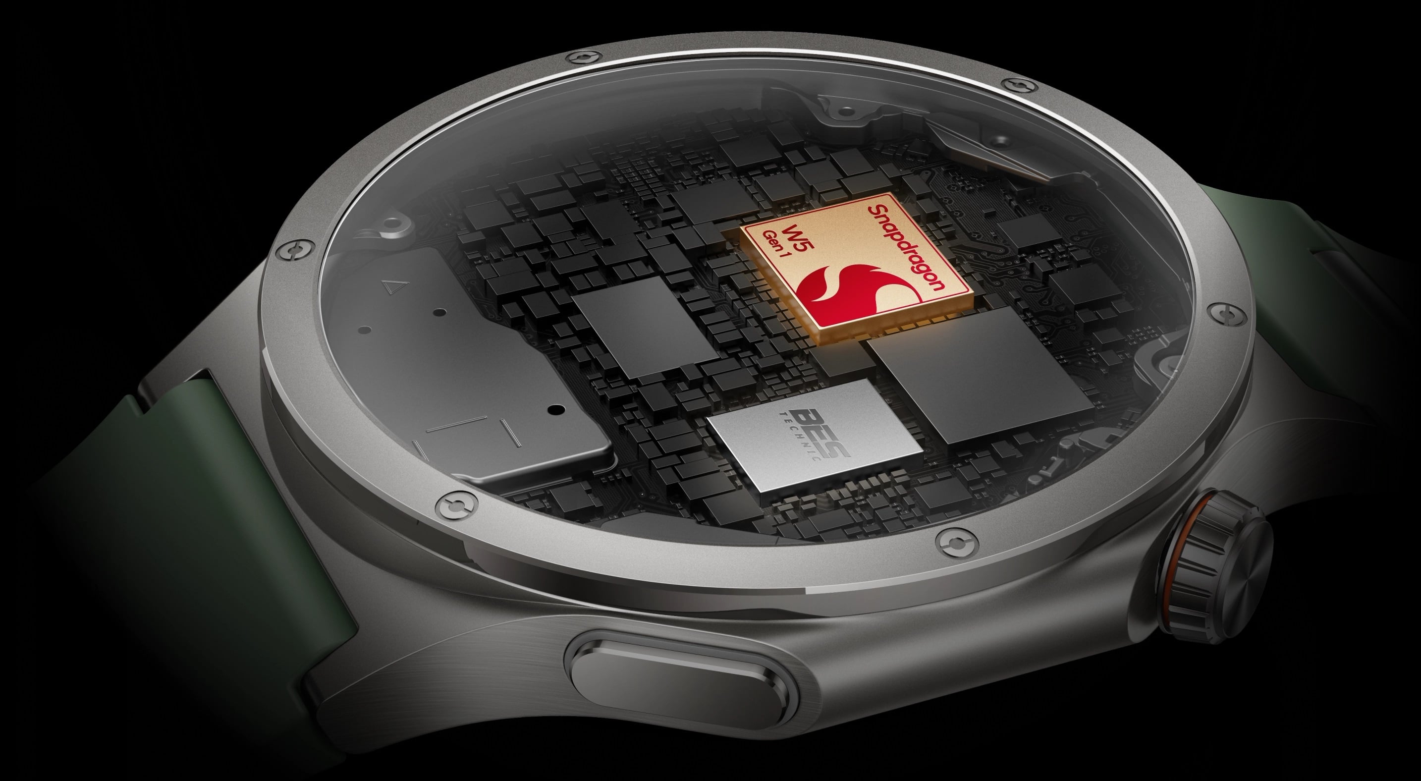A tervezők az újdonságot a Snapdragon W5 Gen 1 rendszerchippel ruházták fel, és emellett jelen van még a tokban egy BES2800 lapka is, ami direkt az ultraalacsony fogyasztásra lett tervezve. Ez a páros megfelelő hatékonysággal fogja kiszolgálni a Wear OS-t és az RTOS alapú szoftveres oldalt.