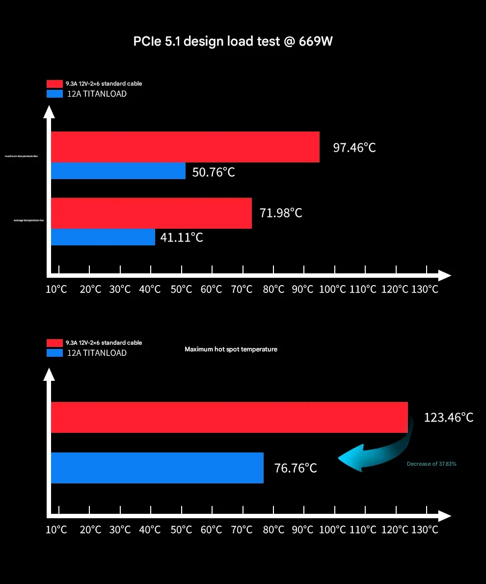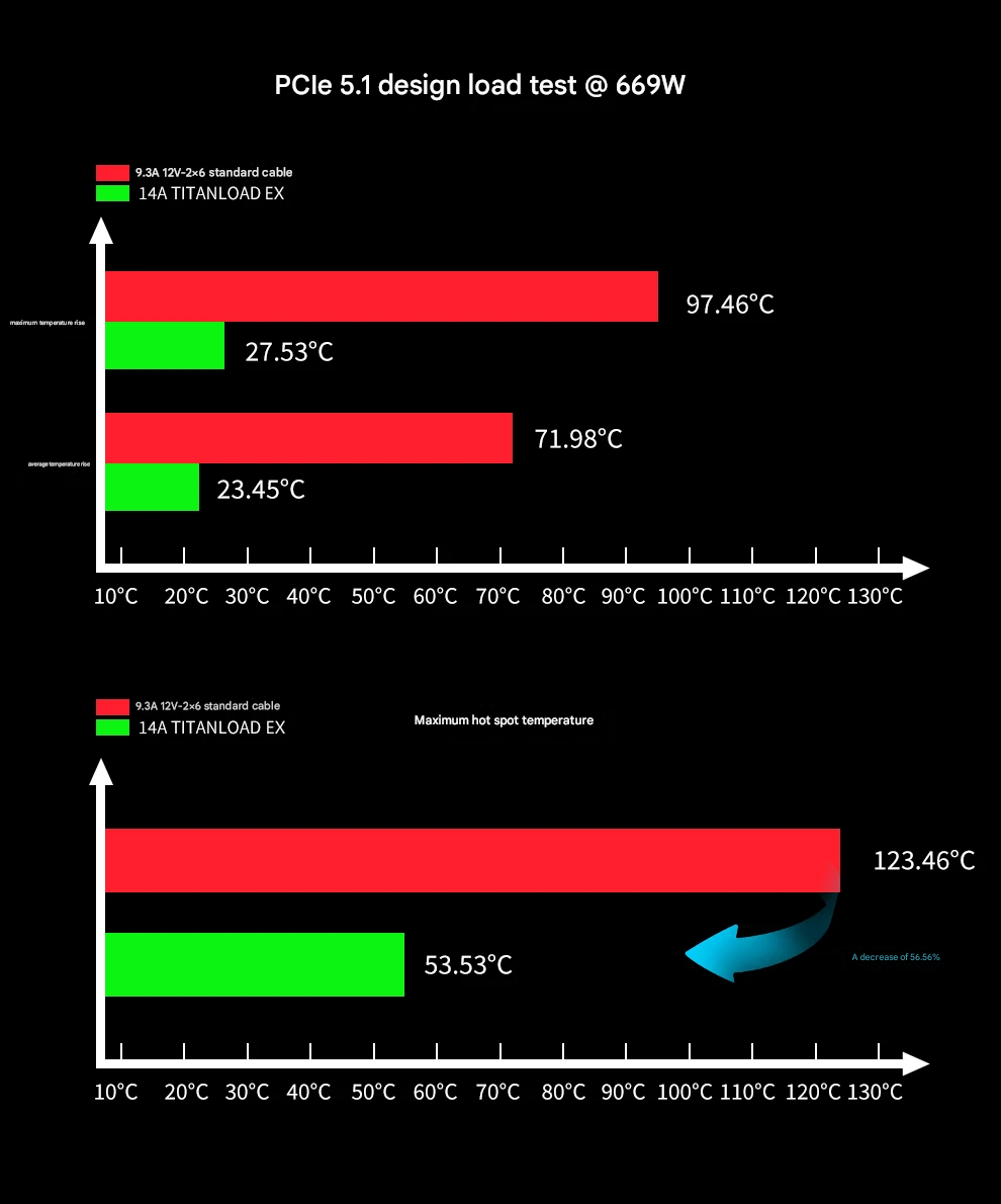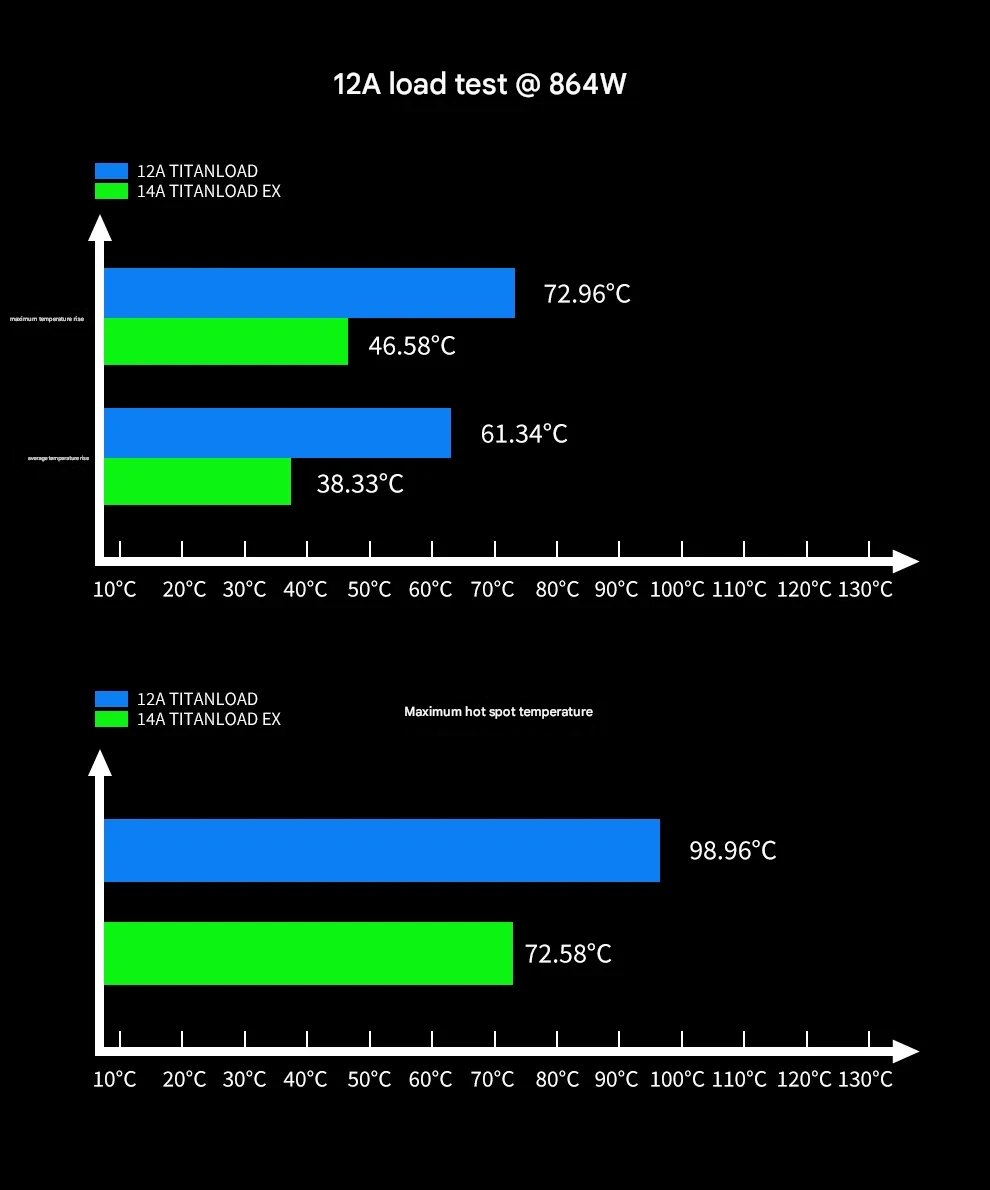 A tesztek alapján a normál 9,3 amperes 12V-2x6 tápkábel a 669 W-tal történő terhelés alkalmával 123,46 Celsius fokos forró ponttal rendelkezett, a hőmérséklet-emelkedés maximuma 97,46 Celsius fok volt, átlaga pedig 71,98 Celsius fok. Ugyanilyen körülmények között a TITANLOAD 12A tápkábel 76,76 Celsius fokos forró pontot, valamint 50,76 Celsius fokos maximális és 41,11 Celsius fokos átlagos hőmérséklet-emelkedést produkált az alapállapothoz képest. A TITANLOAD 14A kábelnél ennél is jobb értékek születtek, ugyanis a legforróbb pont mindössze 53,53 Celsius fokos volt, míg a maximális hőmérséklet-emelkedés 27,53 Celsius fokos, az átlagos hőmérséklet-emelkedés pedig 23,45 Celsius fokos értéket ért el. A tesztek 26 Celsius fokos környezeti hőmérséklet mellett futottak le.
