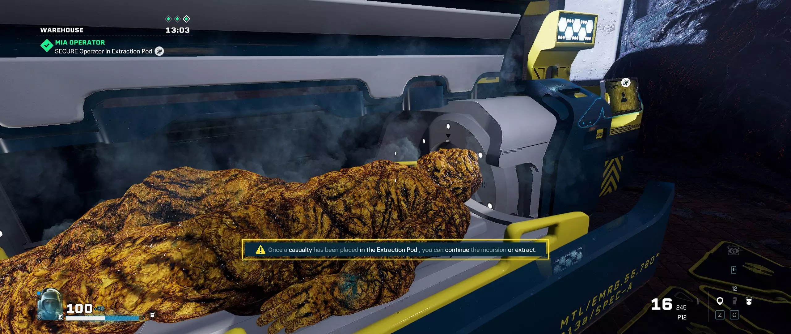 Szerencsére a játék akkor se büntet, ha esetlegesen az összes játékos harcképtelenné válik, ugyanis ilyenkor jön be az Extraction másik újítása. Az elbukott küldetésre küldött operátorunk elérhetetlenné válik egészen addig, amíg újra vissza nem térünk arra a pályára egy másik operátorral és nem szabadítjuk ki. A kiszabadított operátor pedig csökkentett élettel "sebesült" állapotba kerül, amin csak a már korábban említett élettöltési módszer segít.