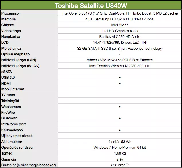 A Toshiba Satellite U840W-t a gyártó hazai képviseletétől kaptuk tesztelésre, köszönjük!