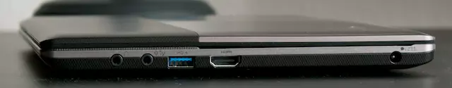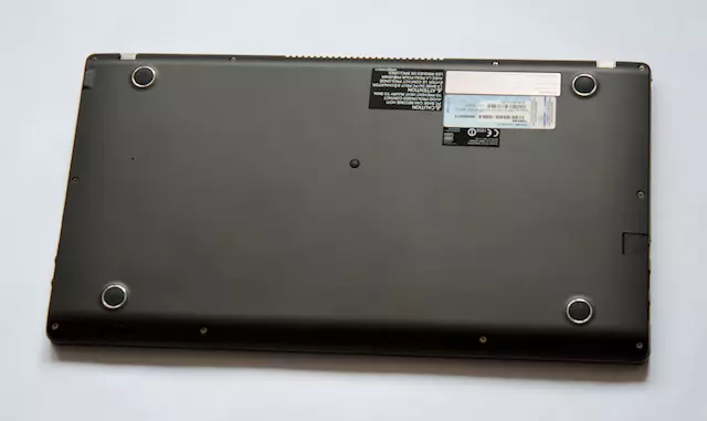 Kétség kívül furcsa látvány a szemnek a nyúlánk noteszgép, ám, ha ezen az anomálián túltesszük magunkat, akkor észrevesszük, hogy egy kifejezetten jó minőségű anyagokkal megépített eszköz van a kezeink között. Bár unalmasnak nem nevezhető a barna festésű alumínium burkolat, mindenképpen elegáns, ahogy a mérnökök megtörték azt egy kis mintás, enyhén gumírozott műanyaggal, igazán stílusos. A gépet megfordítva szembesülhetünk vele, hogy nem ezen fogjuk kiélni a házi barkácsolások iránt érzett szenvedélyünket. Szintén apró, de annál elegánsabb részlet a gumitalpakat körülvevő ezüst gyűrű – mindig is díjaztuk, ha valaki ad az efféle részletekre. Az alsó burkolat egyébként pontosan ugyanabból a gumírozott műanyagból készül, mint a felső egy része, a minőségérzet gyakorlatilag elsőosztályú. A zsanér elég erős, majdnem megtartja mindenféle mágnes és mechanikus zár nélkül a felső burkolatot a kijelzővel együtt, ha a gépet fejjel lefelé fordítjuk. Nincs az embernek olyan érzése, hogy fél éven belül elfárad és a szervíz nyakára fog járni a nyeklő-nyakló szerkezet miatt. A gép egyébként tényleg könnyűnek érződik, az 1,68 kg vélhetően stimmel.