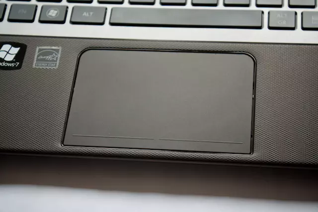 A touchpadből kihozták, amit lehet, legalábbis méretét tekintve. A 21:9-es kijelző egyik nagy hátránya, hogy az ilyen oldalaránnyaal rendelkező panel nem túl magas, ergo az a notebook, amelybe beleteszik, szintén elég alacsony. Ennél fogva, ha egy normális méretű billentyűzetet szeretnénk belepasszírozni, akkor relatíve kevés hely marad a touchpadnek, gyakorlatilag annyi, amennyit a képen látunk. Meglepő, de ez elegendő is a mindennapi használat során, az egyetlen problémát a jobb gomb funkciójának kiváltása fokja okozni, ugyanis ez és a bal is elég nehezen nyomható, ami részben annak köszönhető, hogy integrálták őket az eszközbe. A nagyon széles kép miatt az átlagosnál több vízszintes mozgásra készüljünk, amely az enyhén téglalap alakú tapipad miatt sok ujjfelemelést von maga után.