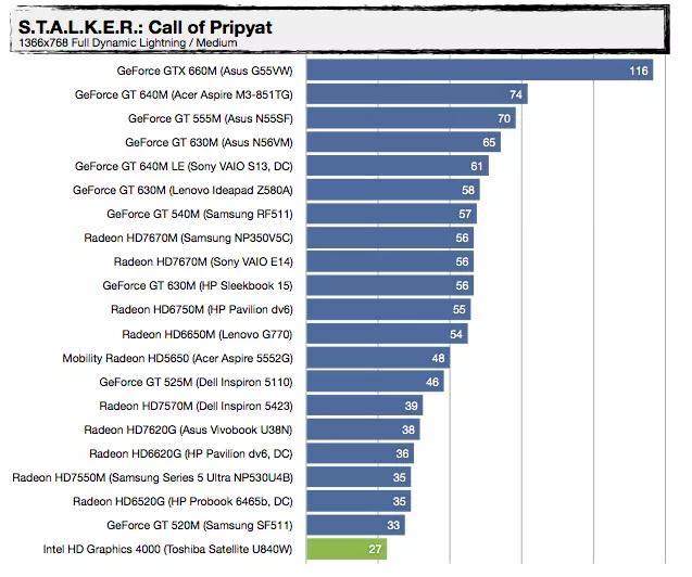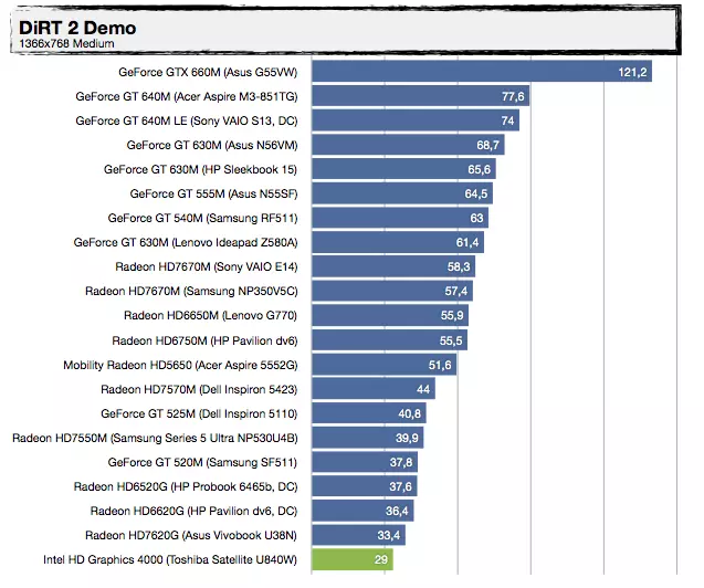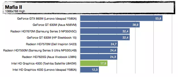 A HD Graphics 4000 sosem volt a játékos lelkű felhasználók álma, a grafikonokra pillantva talán megértjük, miért. Ritkán sikerül elmozdulnia az utolsó helyről, legtöbbször az összes ma kapható modern integrált megoldás megelőzi, talán a Haswell architektúra érkezésével változik majd a helyzet egy kicsit, bár ehhez nem csak a sebességnek, hanem a meghajtó programoknak is fejlődniük kell.