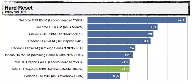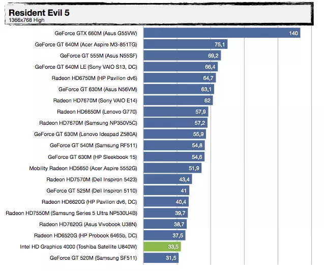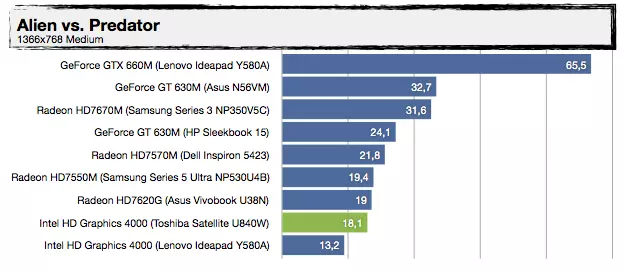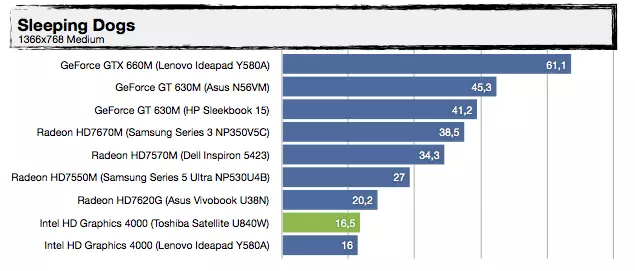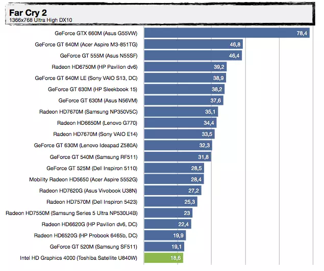 Az U840W hardvere abszolút ismerős lehet már olvasóink számára, hiszen az alacsony fogyasztású Core i5-tel szerelt Ultrabookok közül nem ez az első, amely nálunk jár. Ahogy a grafikonokról is leolvasható, hozza azt, amit a korábbi tesztek alapján vártunk tőle, így ugorjunk is gyorsan tovább a videokártyára, amelyet először eresztettünk össze nála sokkal erősebb versenyzőkkel is.