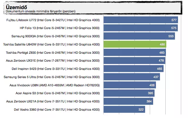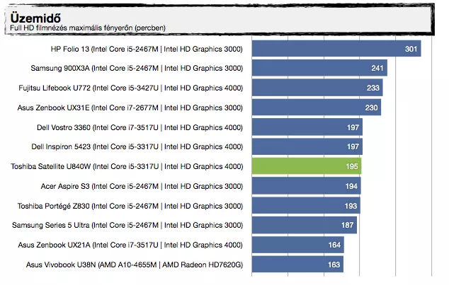 Üzemidő tekintetében az átlagot tudja megütni az U840W, amely egyben azt is jelenti, hogy a gyártó által prognosztizált 7 óra 45 perc összehozható, igaz, nagyon alacsony fényerő és gyakorlatilag minimális használat szükséges hozzá. A nagy felületű kijelző és a magas fordultaszámával a szükségesnél többet fogyasztó ventilátor a legkomolyabb terhelés mellett már némi leszakadást hoz a többiekhez képest, de ez nem több szűk negyed óránál.