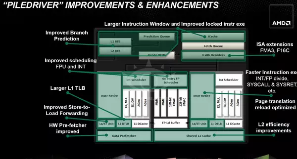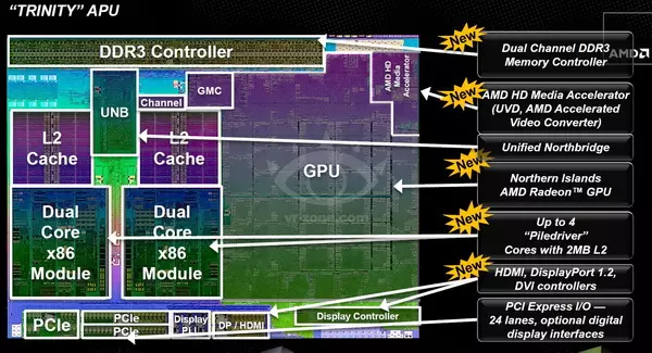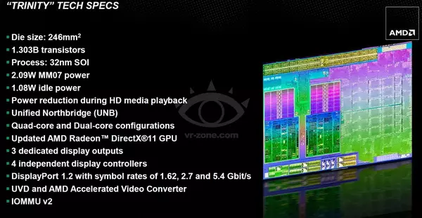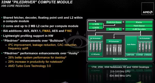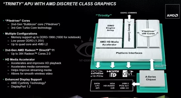 Az már biztos, hogy a Trinity APU-k processzormagjai az AMD Bulldozer architektúrájának frissített változatára a Piledriver-re alapoznak. A diák alapján – ahogy az a korábbi pletykákból már tudható – az új processzormagok több művelet végrehajtására képesek órajelenként. A kettő- és négymagos példányok 2 GHz és 3,8 GHz közötti magórajelen üzemelnek majd, természetesen modelltől függően. 4 GHz feletti órajelre nem számíthatunk, mint például a Bulldozer alapú FX-4170 esetében, de a Trinity APU-k között cserébe nem is lesz 125W-os TDP-vel rendelkező példány – a legnagyobb étvágyú modellek is csak 100 wattos TDP-vel bírnak majd (és ebben ugye már benne van a grafikus vezérlő is).