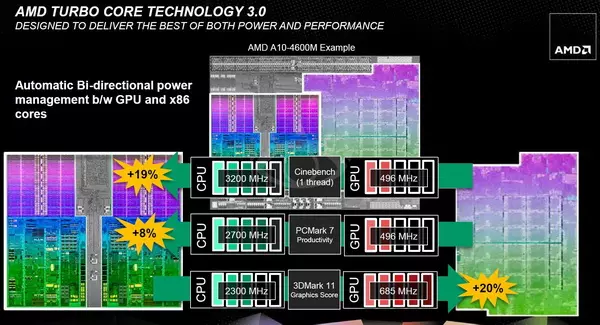 A diák egyéb érdekességekről is lerántják a leplet. Ilyen érdekesség az AMD Accelerated Video Converter funkció és a Turbo Core eljárás harmadik generációs kiadása. Előbbi egy hardveres gyorsításon alapuló videó kódoló szolgáltatás, míg utóbbi a Turbo Core 2.0-s technológia továbbfejlesztett változata, amely a processzormagok mellett az IGP órajelét is képes dinamikusan változtatni a pillanatnyi terheléstől függően.