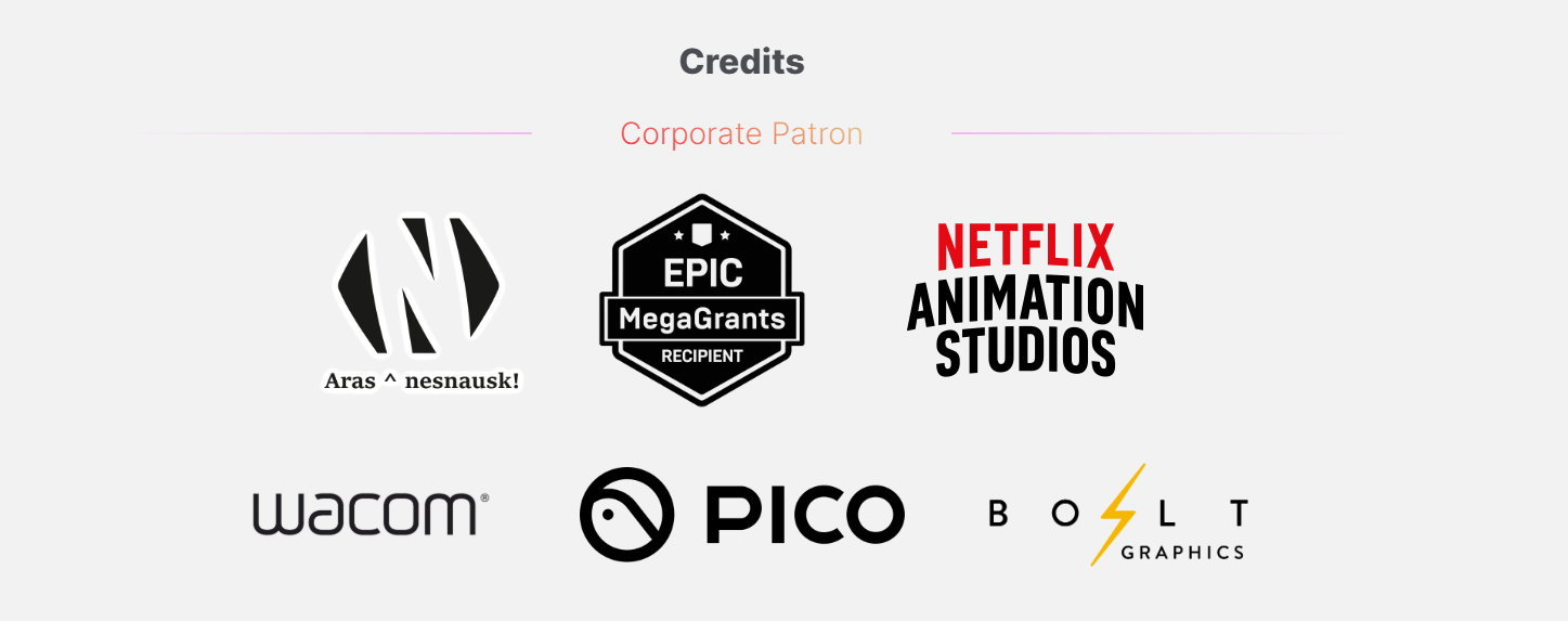 Az Epic Games, az Aras, a Wacom, a Pico és a Bolt Graphics mellé legnagyobb támogatónak ezúttal a Netflix Animation Studios csatlakozott be.