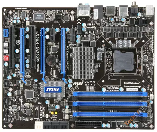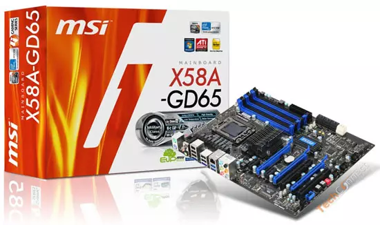 Az MSI X58A-GD65-ös alaplapja nyolcfázisú tápellátással érkezik és heat pipe alapú hűtés helyett egyszerű hűtőbordákat alkalmaz, már ami a VRM áramkör, az X58 IOMMU és az ICH10R chip hűtését illeti. A deszka három darab PCI Express 2.0 x16-os slotot tartalmaz, amelyek közül kettő az X58-as északi hídhoz kapcsolódik, ezek teljes, x16-os sávszélességet kínálnak; míg a harmadikat az OCH10R típusú déli híd szolgálja ki, méghozzá x4-es sávszélességgel. A terméken a felsoroltakon kívül két PCI Express x1-es és két hagyományos PCI slot is jelen van. Az alaplap a hírek szerint csak és kizárólag CrossfireX támogatással érkezik, SLI módot nem kínál. A hat darab DDR3-as memóriafoglalat maximum DDR3-2133 MHz-es modulok alkalmazását teszi lehetővé, rendszermemóriából pedig szokás szerint maximum 24 GB-nyit használhatunk (6 x 4 GB).