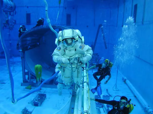 Dottie Metcalf-Lindenburger mosolyogva integet, miközben egy citromsárga daru űrruhástul beleereszti a világ legnagyobb fedett úszómedencéjébe. Amikor a víz összezárul a feje fölött, három búvár úszik a közelébe. Kiszabadítják a kilencven kilós öltözéket viselő űrhajóst a tartóhevederekből, majd lesegítik a medence aljára, ahol a Nemzetközi Űrállomás egy részletének életnagyságú másolata terpeszkedik. A búvárok óvatosan forgatni kezdik az asztronautát, körbe, majd fejjel lefelé és visszafele irányítják, és közben elvégzik a súlytalanságot imitáló lebegtetőrendszer finomhangolását.