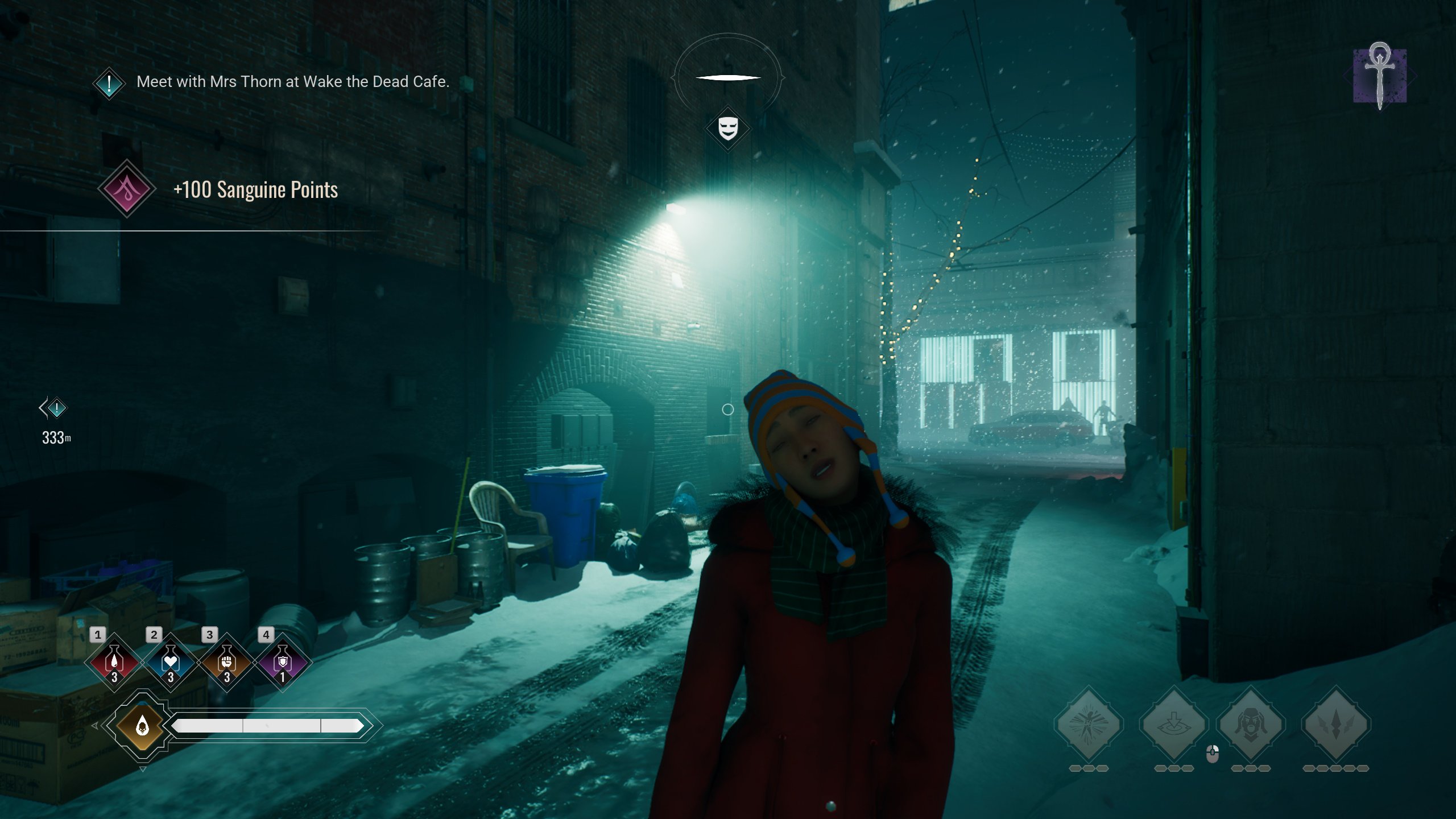 Lesznek heves vérmérsékletű, dühös (Choleric), szomorú, lehangolt (Melancholic) és lelkes, felajzott (Sanguine) emberek a tömegben, akiket szépen el kell csalnunk valami félreeső helyre és ott egy kevés érzelmileg „feltöltött” vért szerezhetünk tőlük – ez lesz a „fizetőeszköz” a skillek megszerzésénél és jó sok kell belőle. Az elcsalogatás sem feltétlenül egyszerű feladat, hacsak nem vagy Torreador, de néha maguktól is jönnek, ami meglepő, hiszen vadidegenek vagyunk, de ez legyen a legnagyobb bajunk. Néha hagyni kell, hogy addig kergessenek, míg egy megfelelő helyre nem jutunk, máskor pedig nem fog érdekelni minket, hogy ki látja a vérszívást, mert a maszkabál megsértése sem akkora gond, mint hisszük.